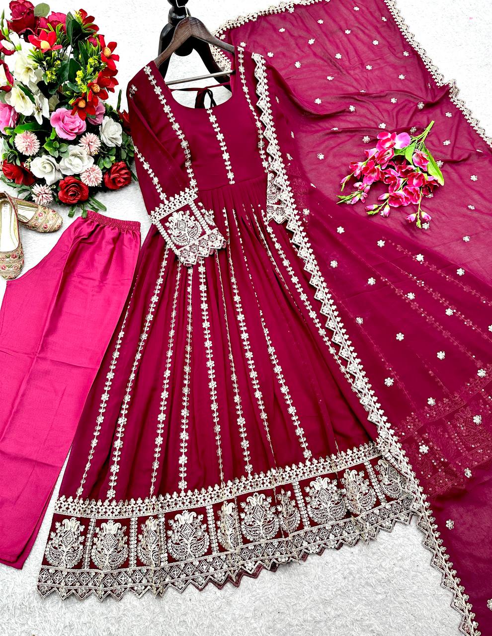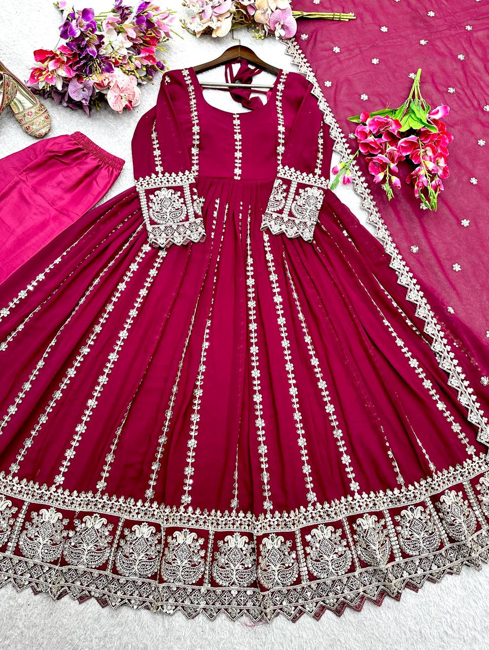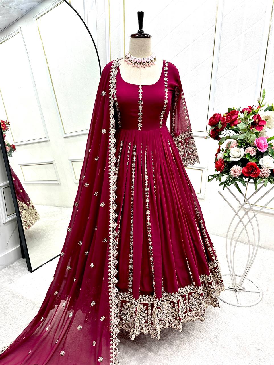 🩱Gown Fabric: Pure Blooming Georgette with Embroidery 5mm Siqwans & Coding Dori Work With Sleeves With Ped With Fancy Latkan Dori