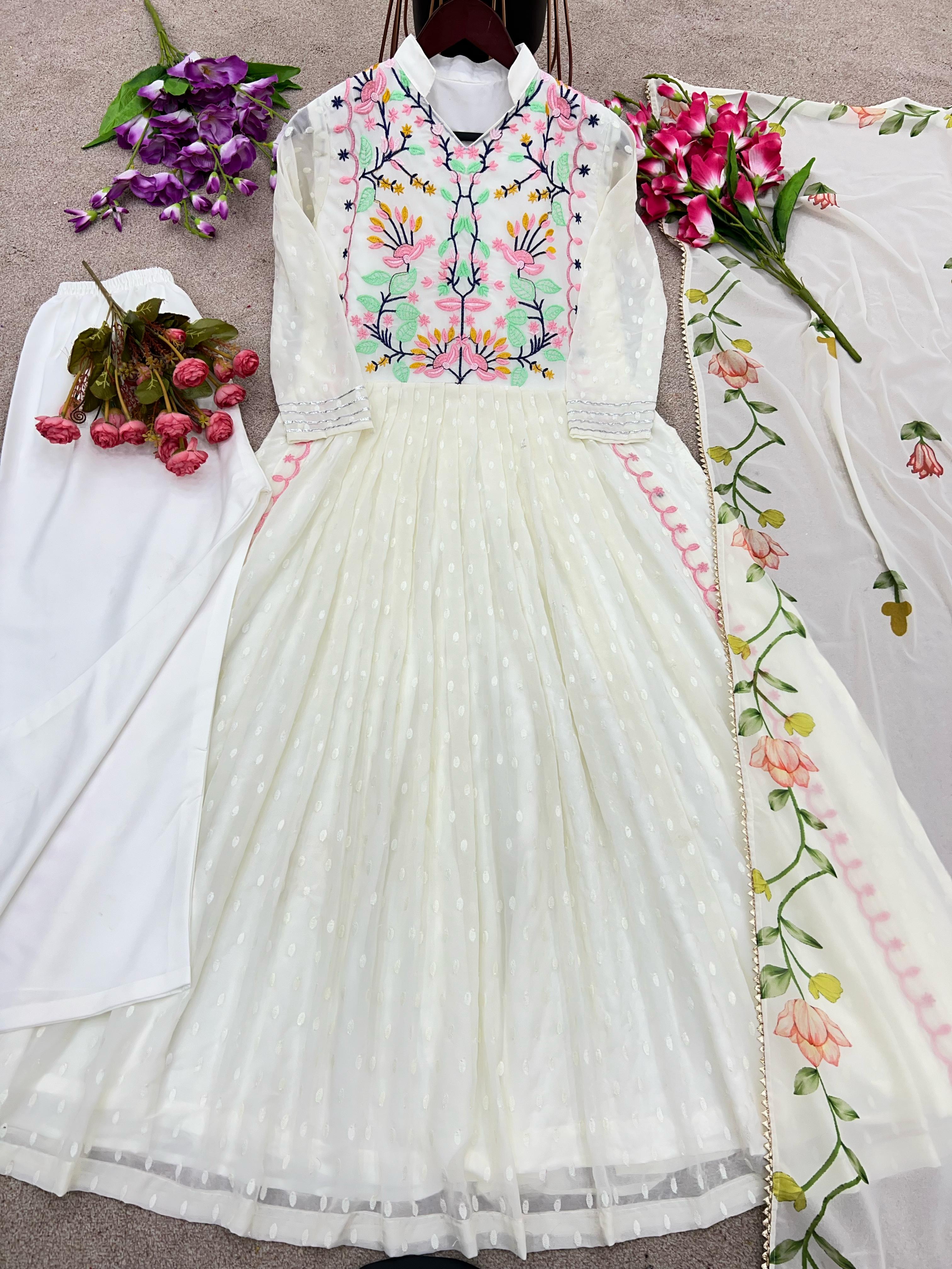 Amazing  Embroidery Malty Thread Work White Color Anarkali Suit