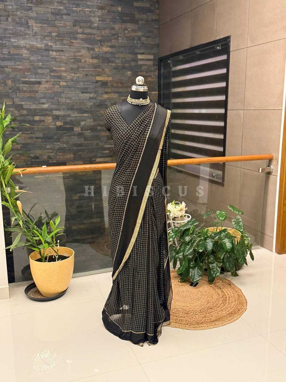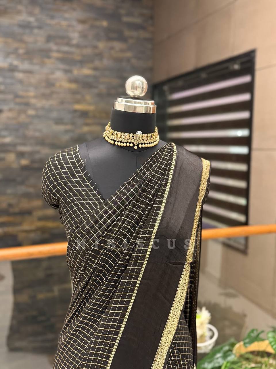 Experience the elegance of pure viscose georgette with intricate small chex weaving and a stunning satin patta border perfect for any occasion this saree exudes sophisticated and style