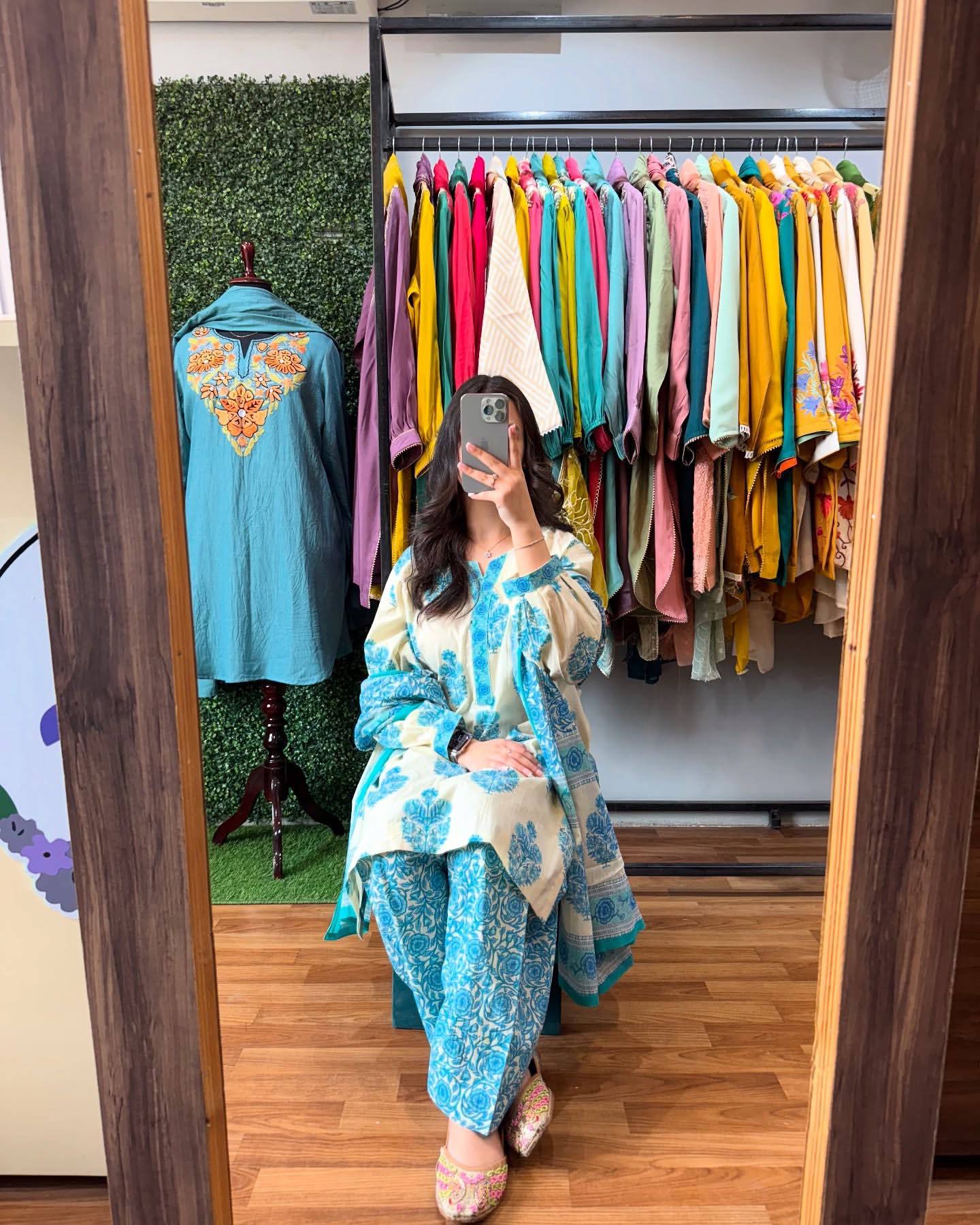 Casual Wear Digital Printed Sky Blue Color Palazzo Suit