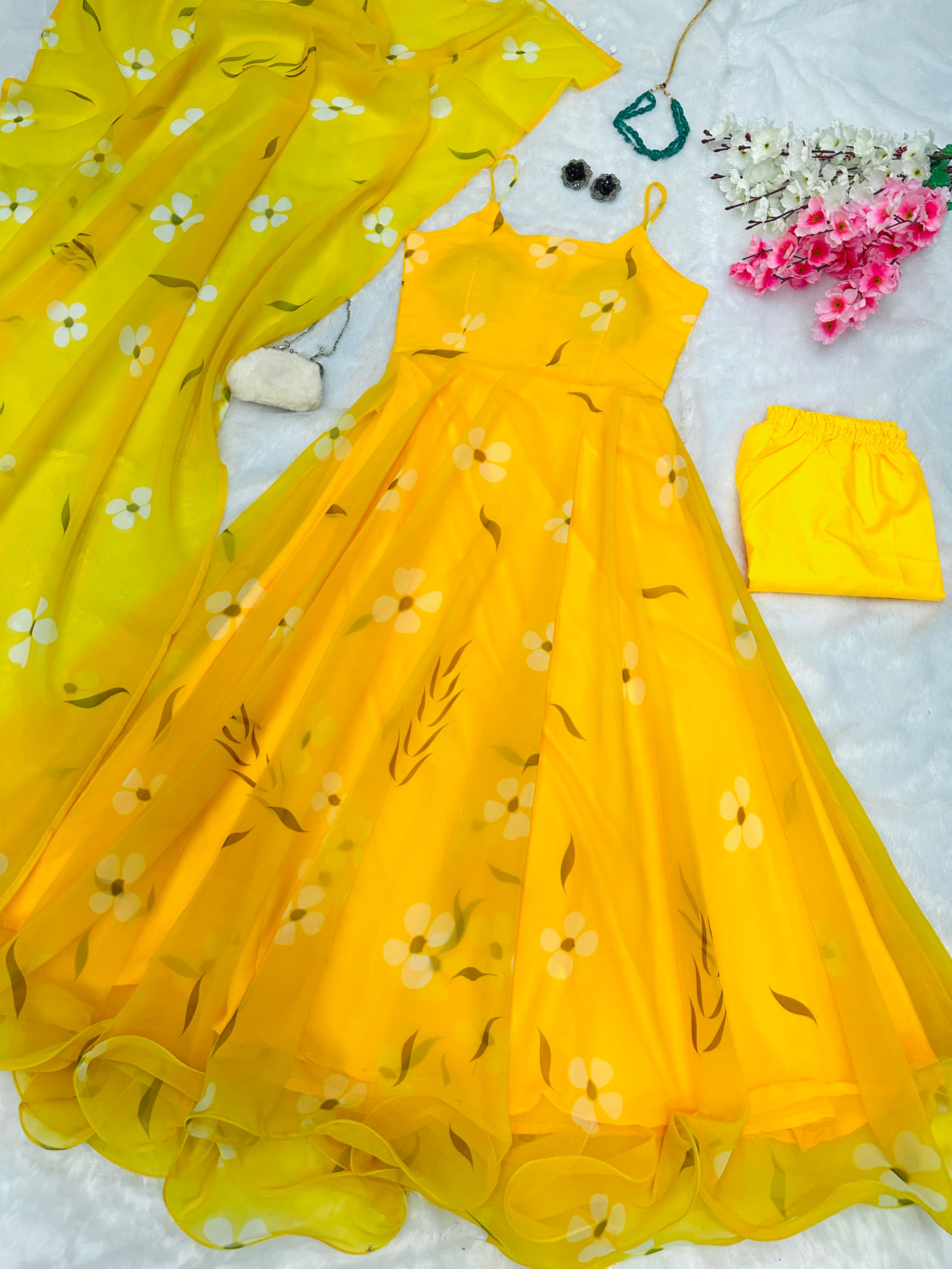 Classy Digital Printed Yellow Color Gown