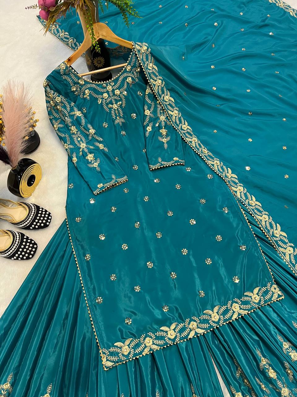 *Palazzo Fabrics* :Pure Heavy Natural Crepe Silk Heavy Embroidery Work With Moti Work Fancy Borders Less Work Fully Flair.