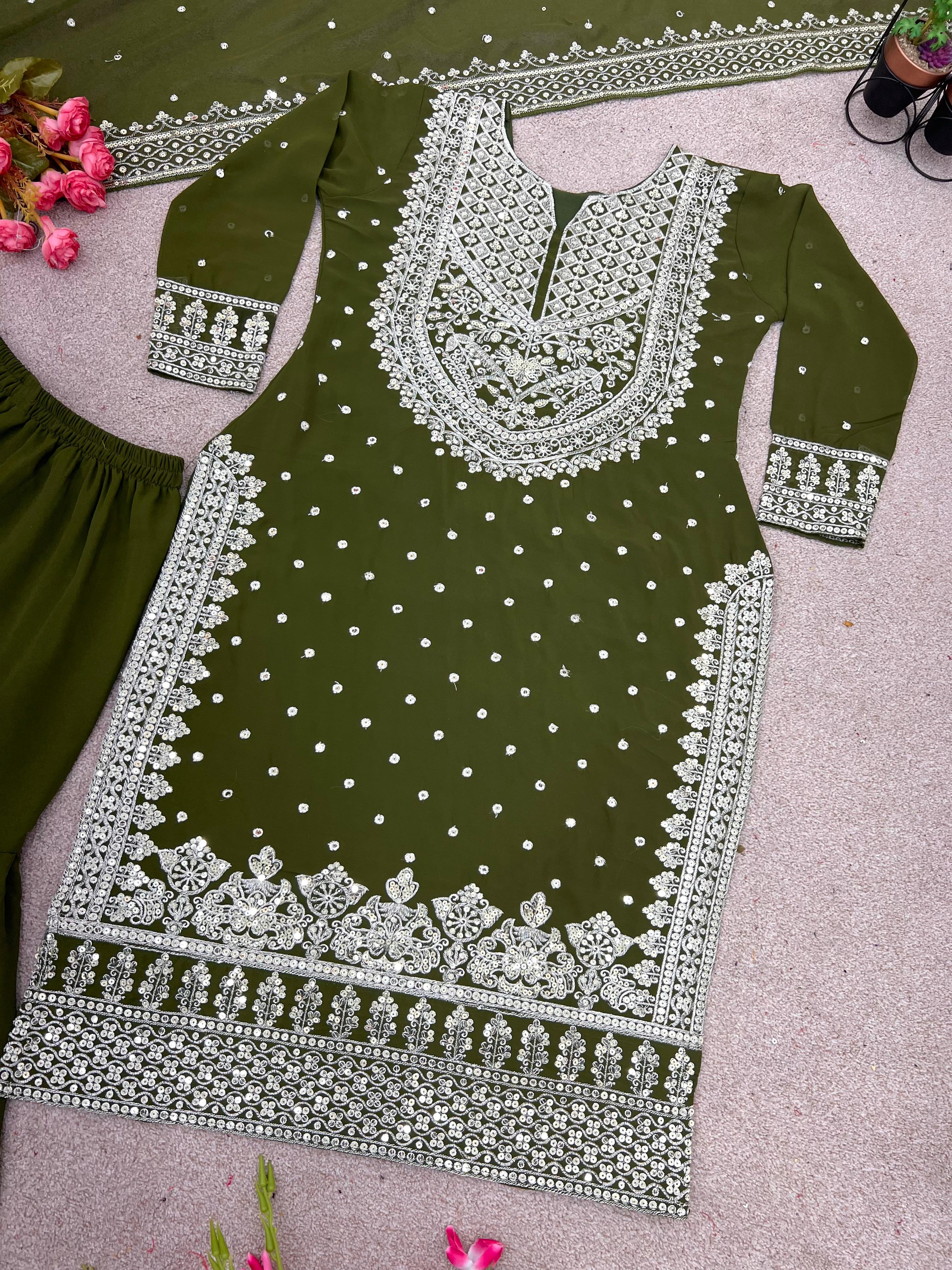 Decent Embroidery Sequence Work Mehndi Color Sharara Suit
