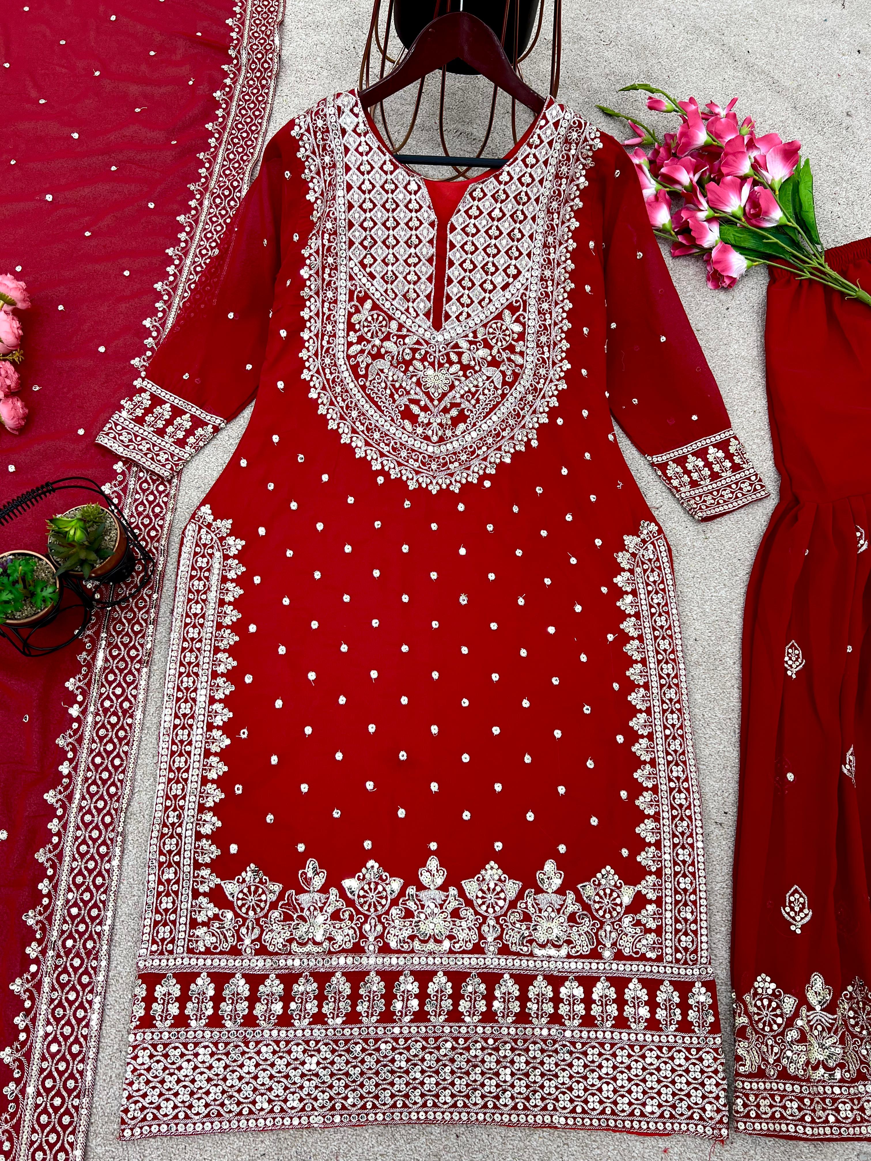 Decent Embroidery Sequence Work Red Color Sharara Suit