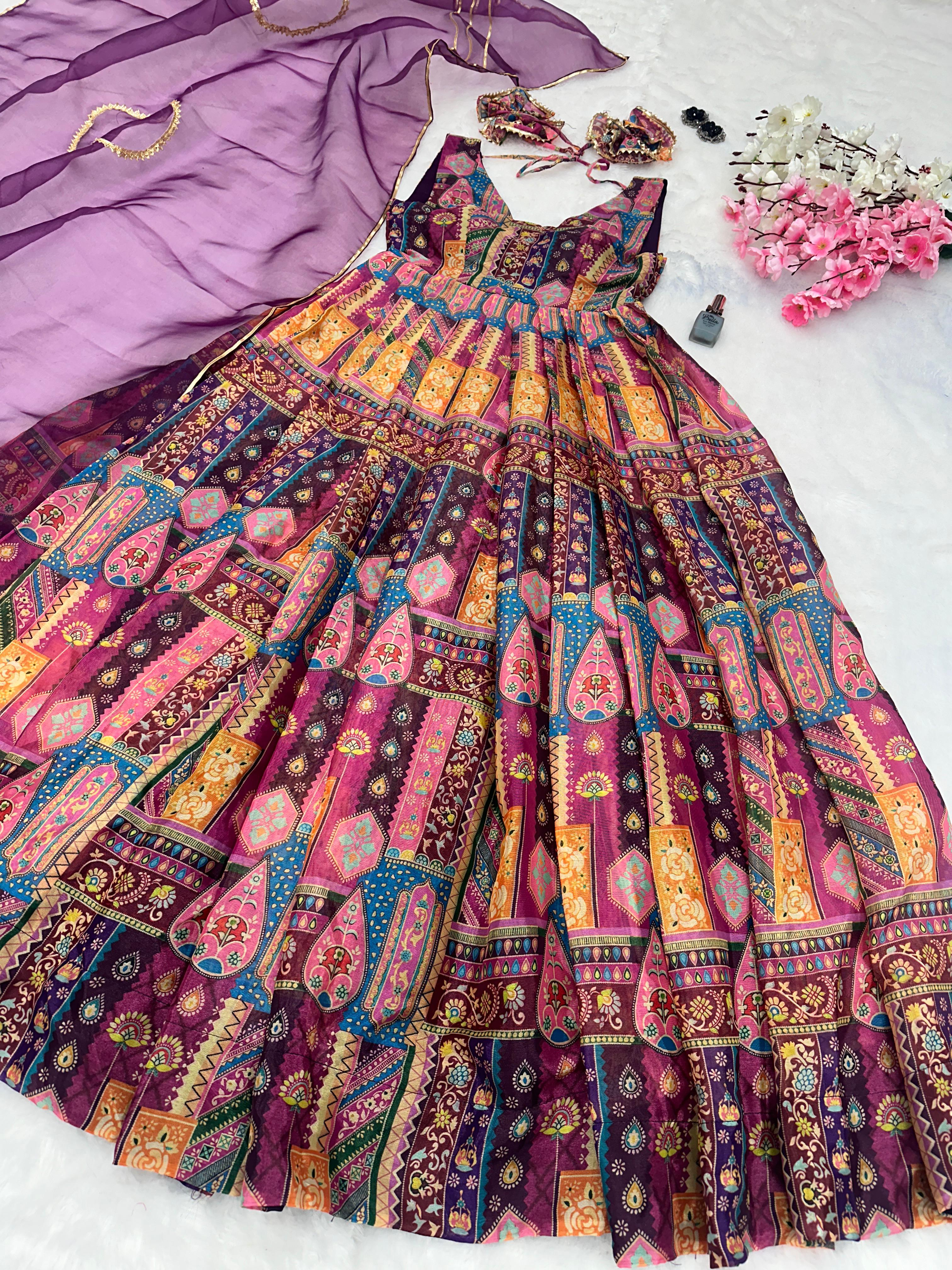 Designer Multi Organza Silk Digital Printed Purple Color Long Gown