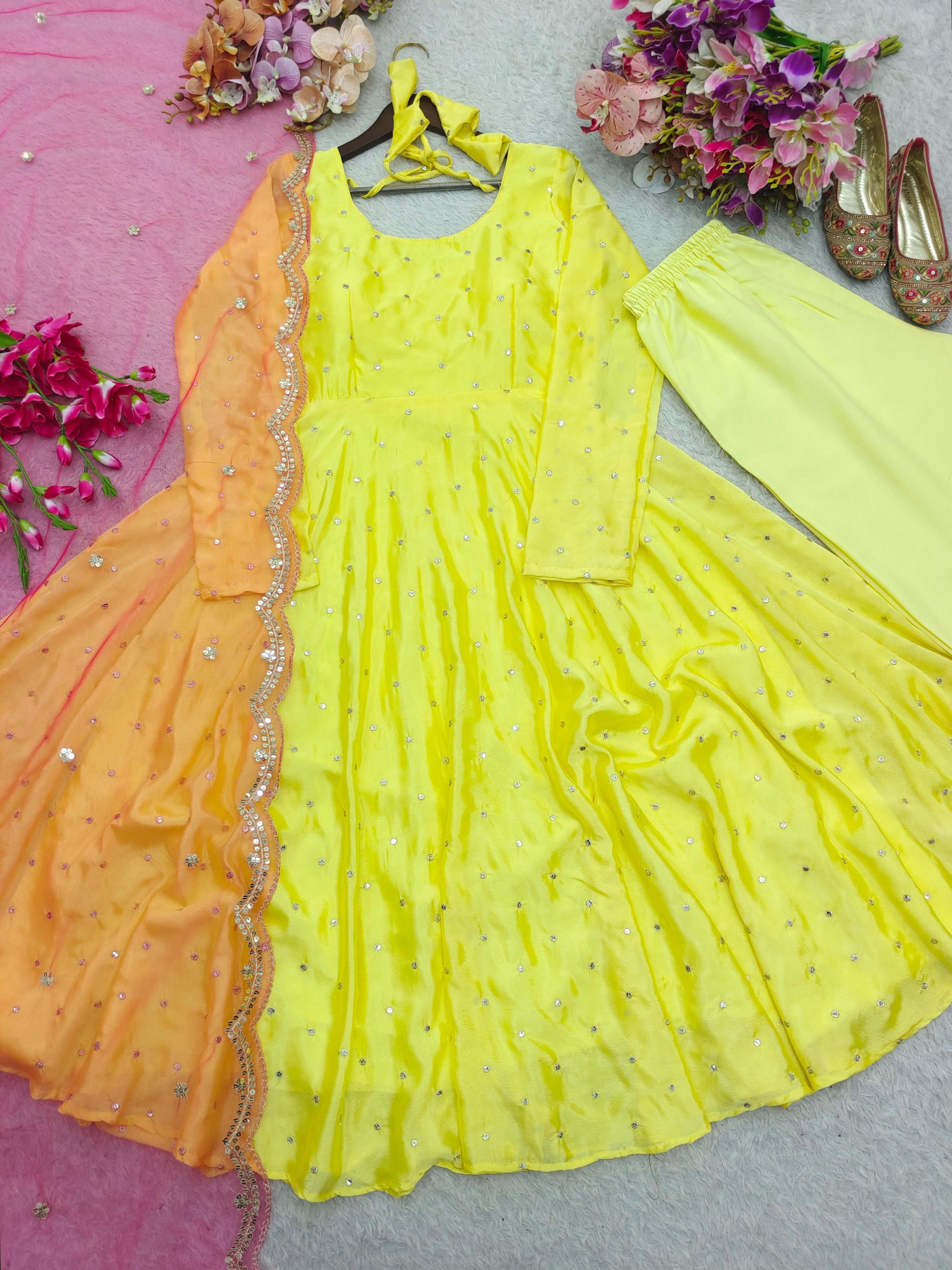Designer Lemon Color Chinon Silk Work Gown