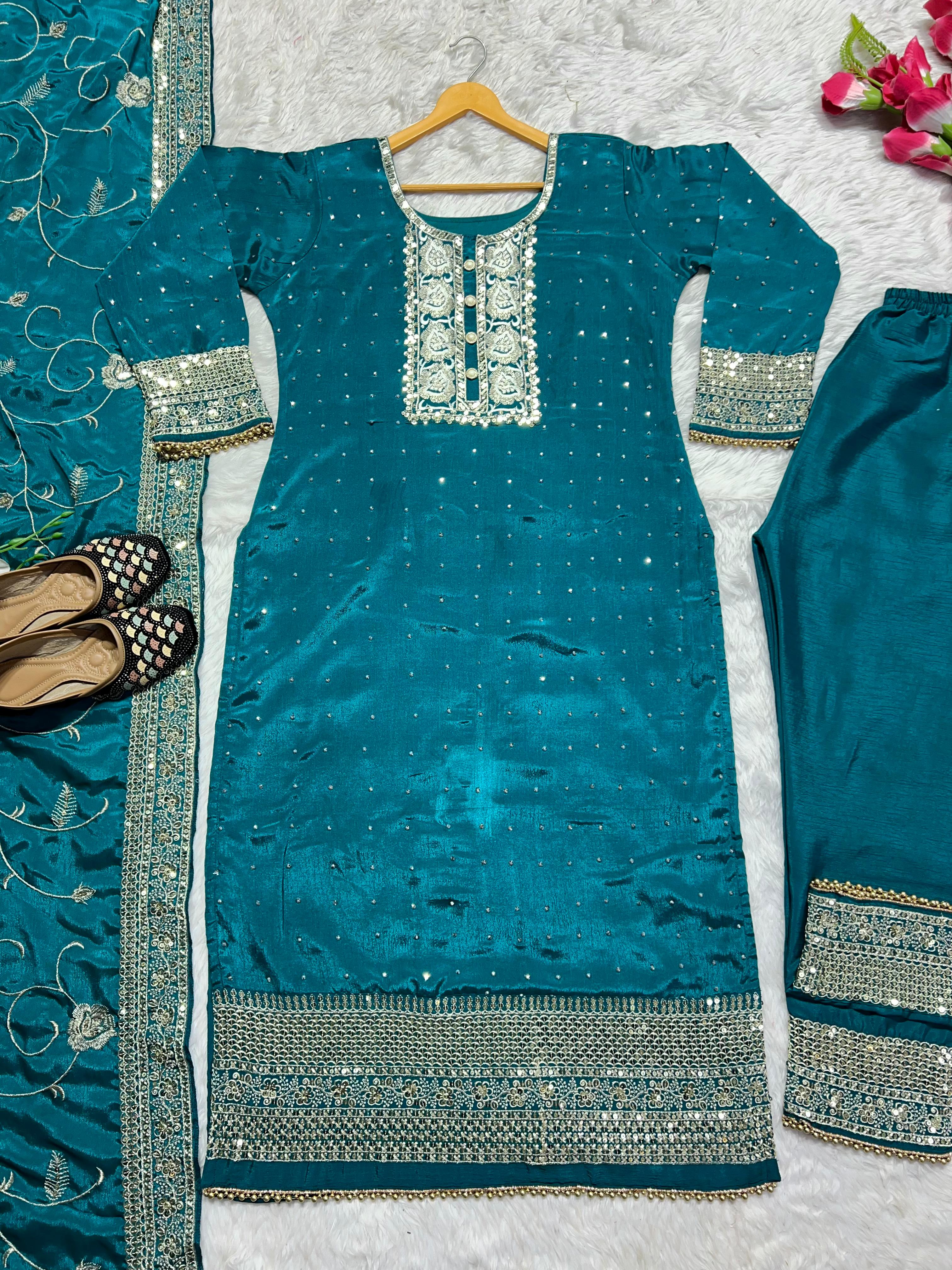 Embellished Embroidery Work Rama Color Anarkali Suit