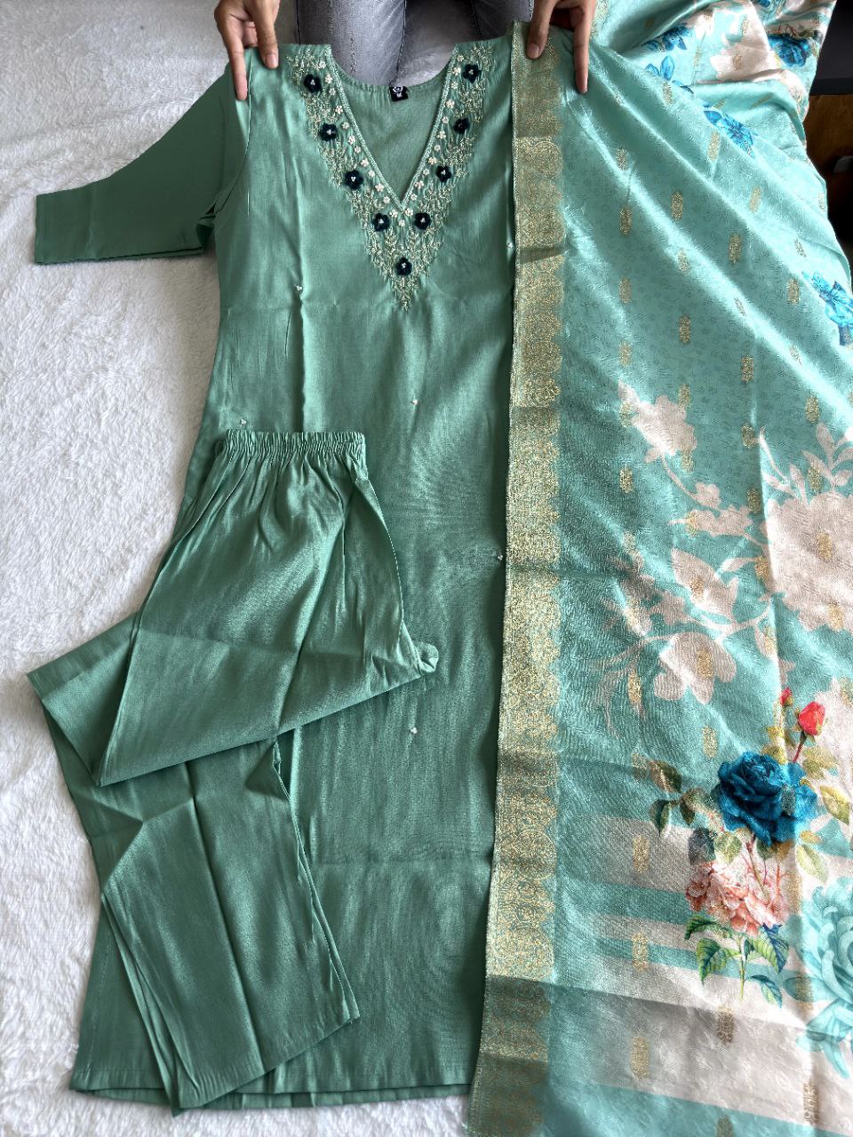 Pista Green V-Neck Floral Embroidered Kurti Set