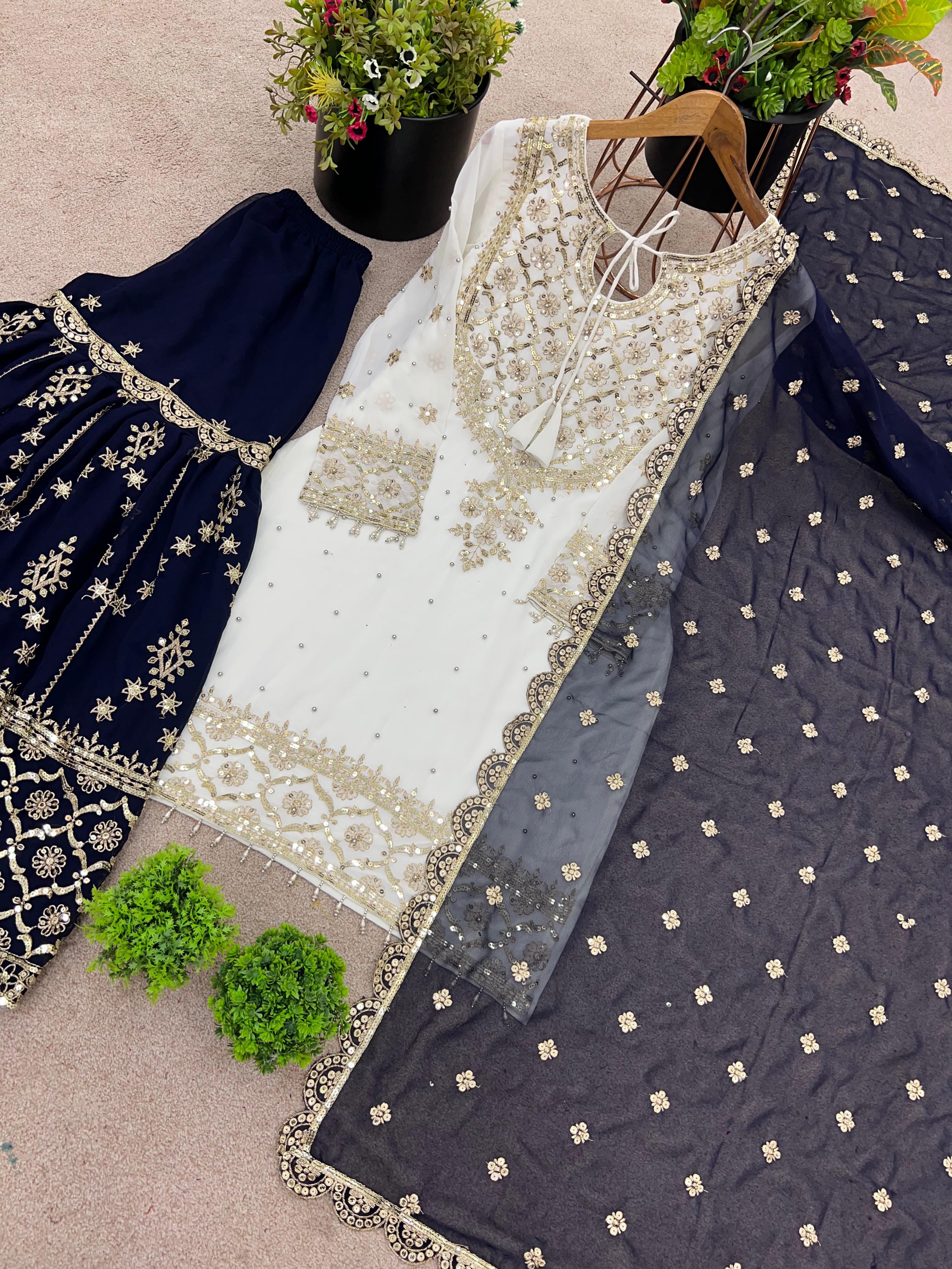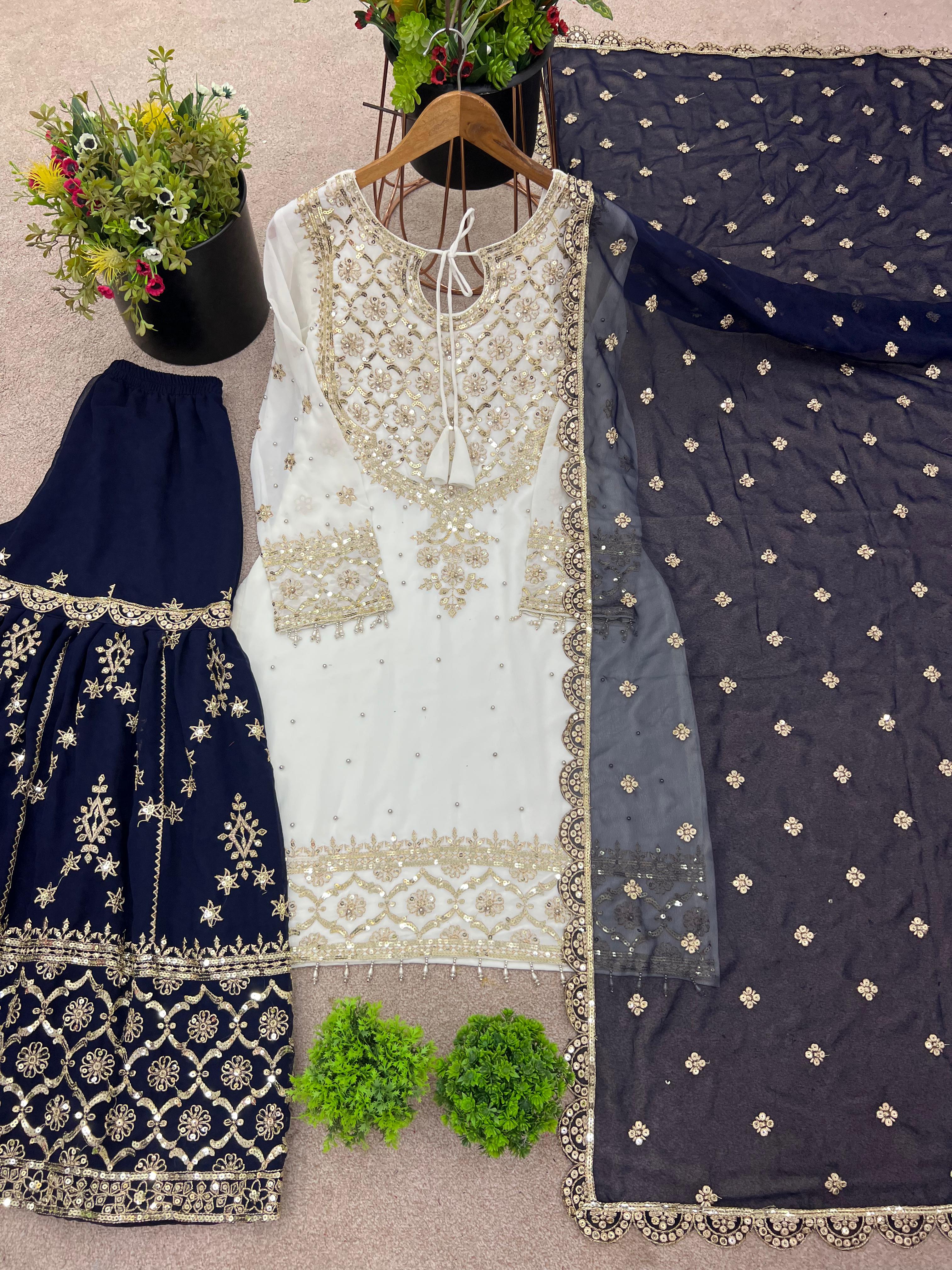 Exclusive Heavy Work White Color Suit Navy Blue Sharara