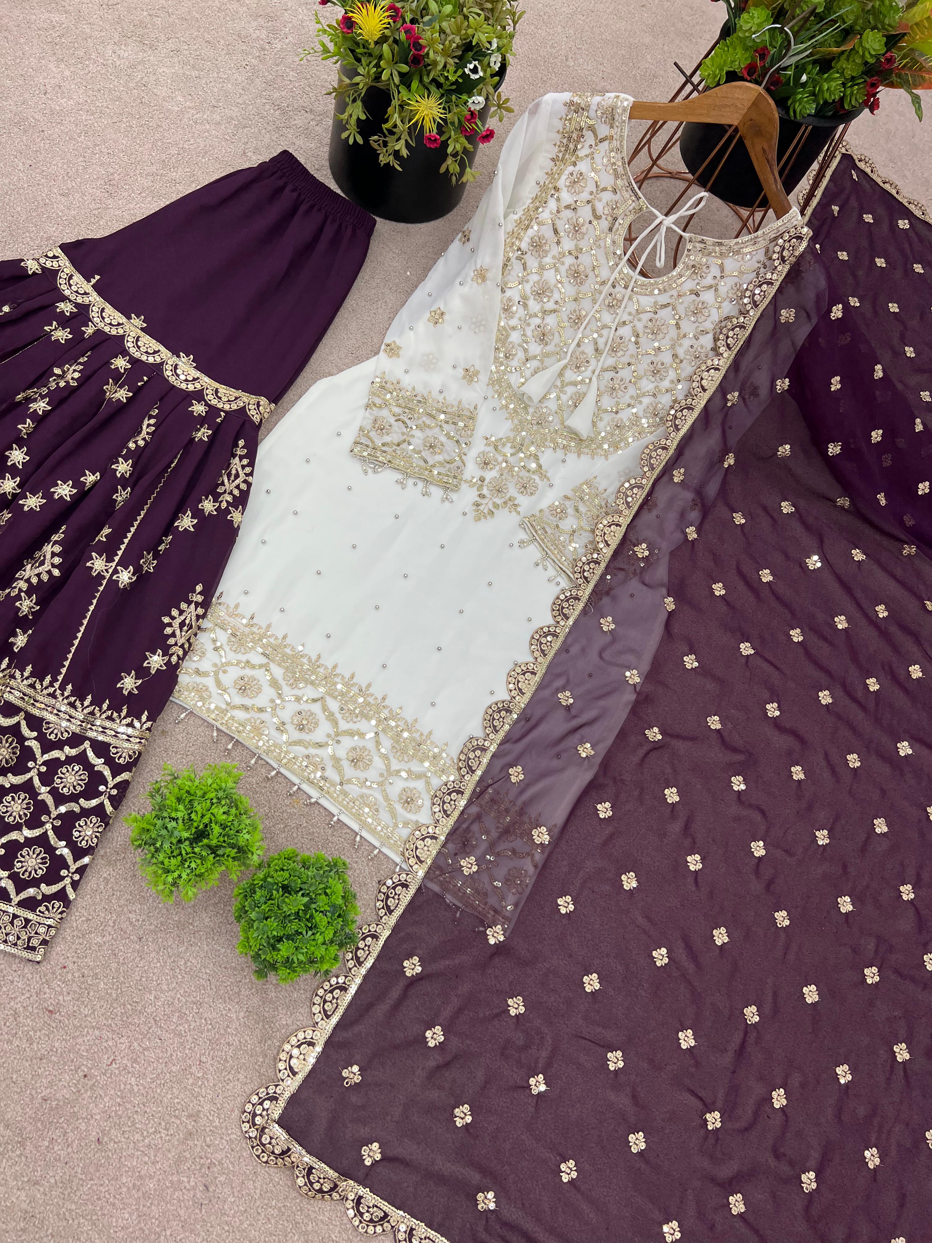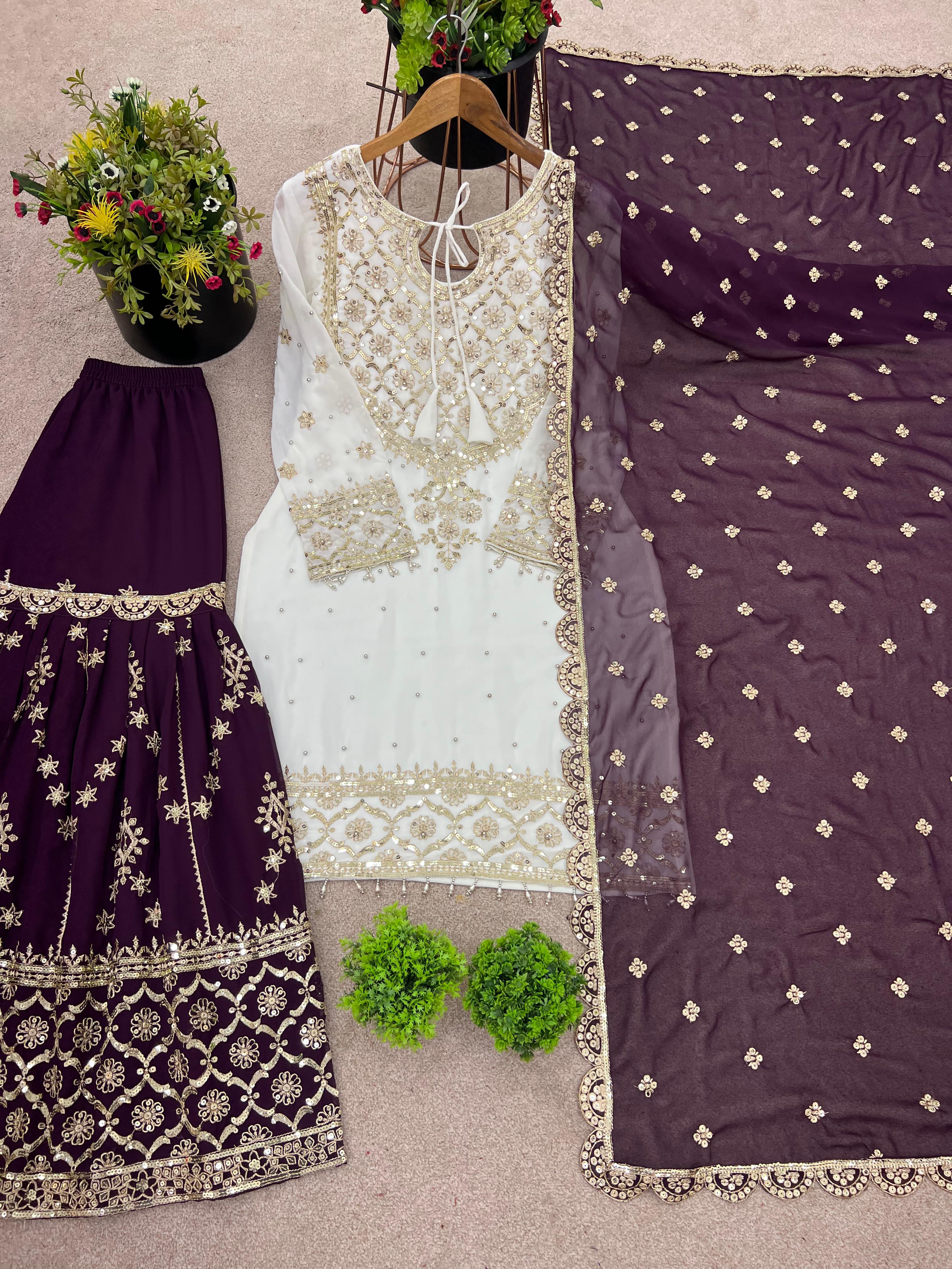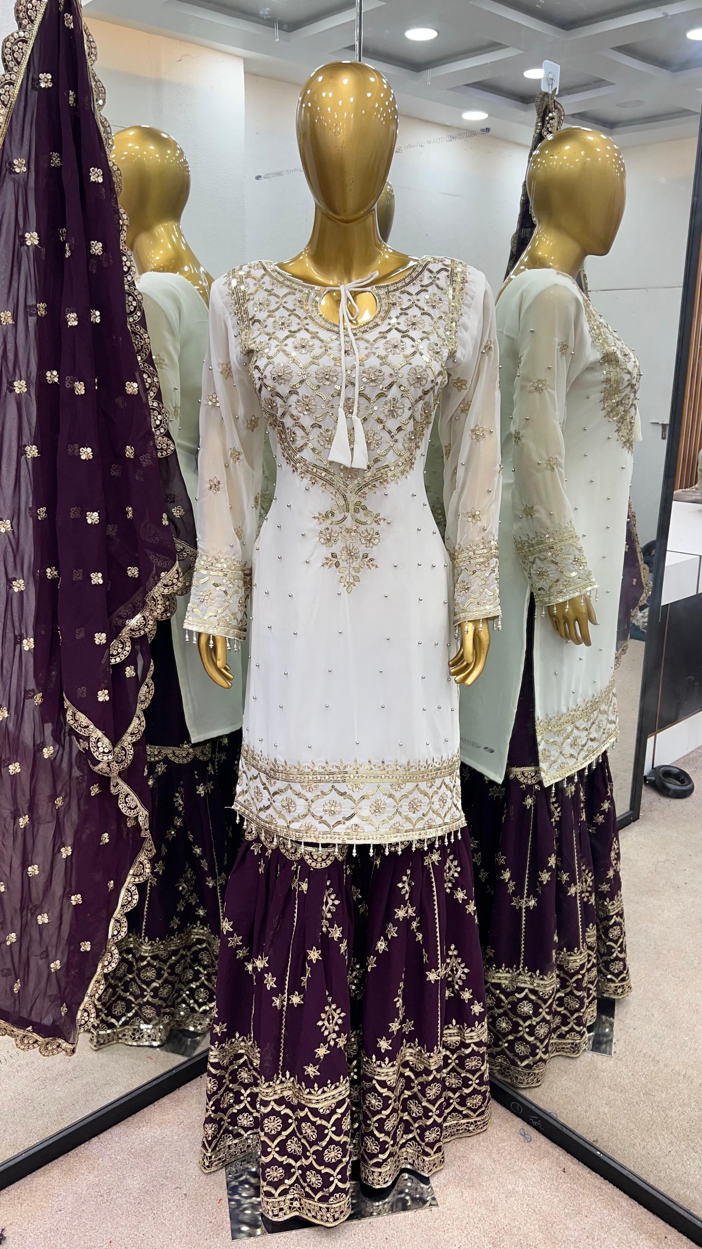Exclusive Heavy Work White Color Suit Wine Sharara