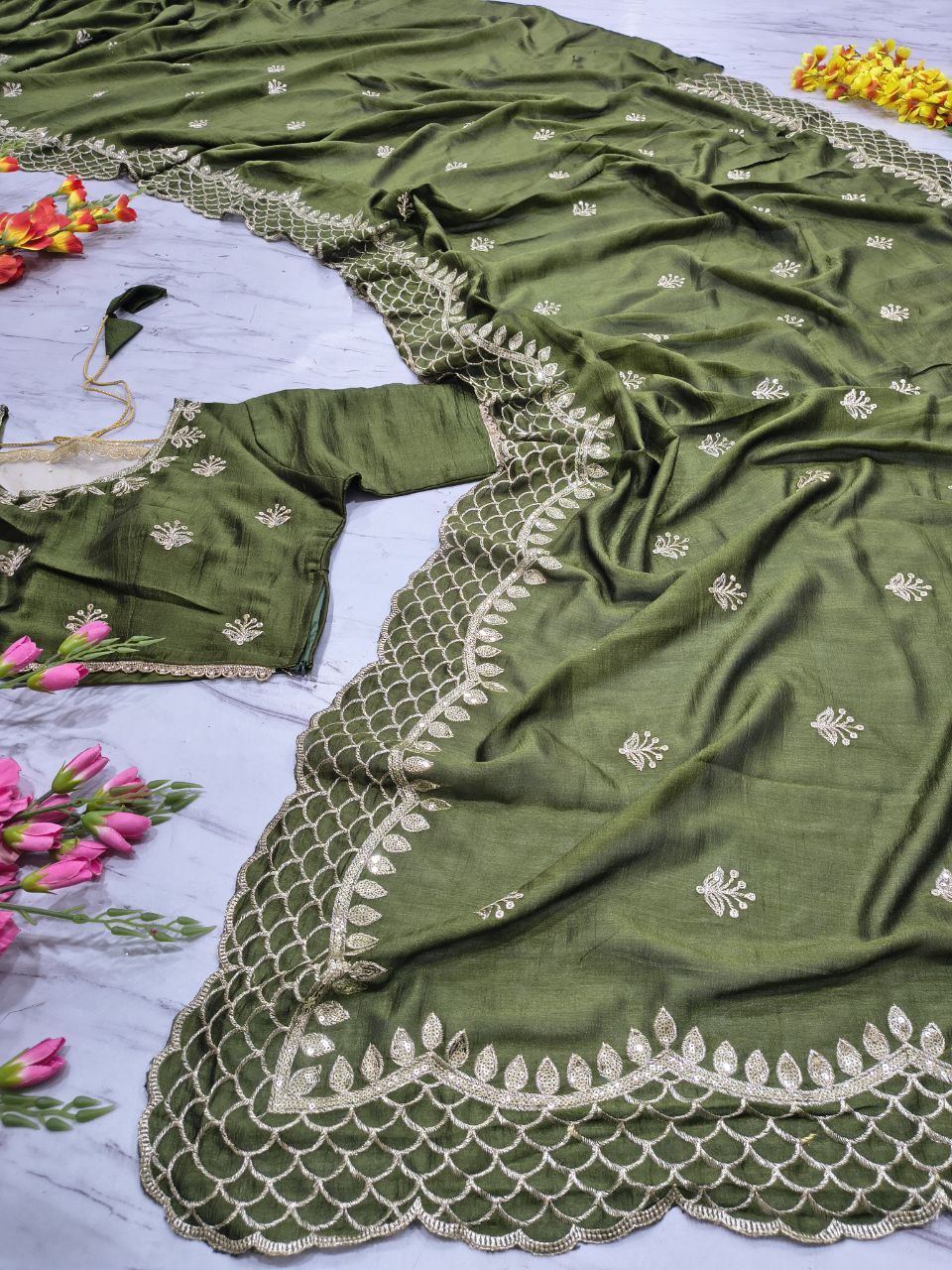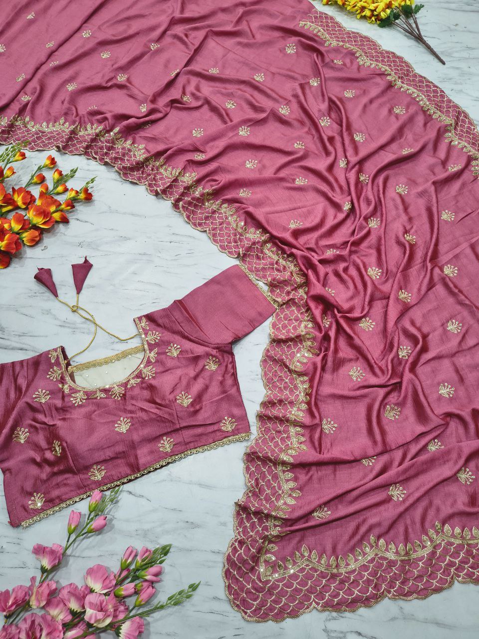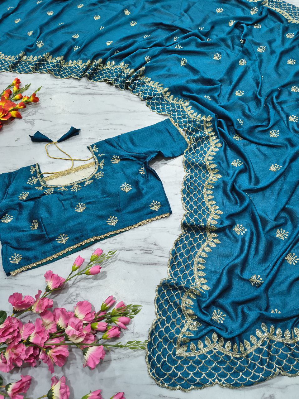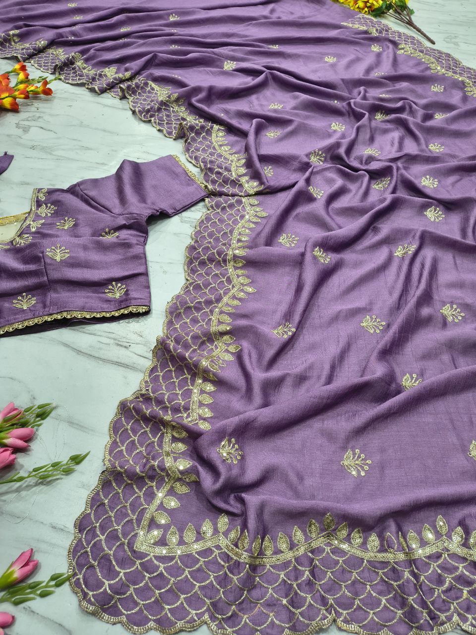 Saree: Premium Soft Vichitra Silk Embellished With Beautiful Thread Embroidery And 3mm Sequins Work