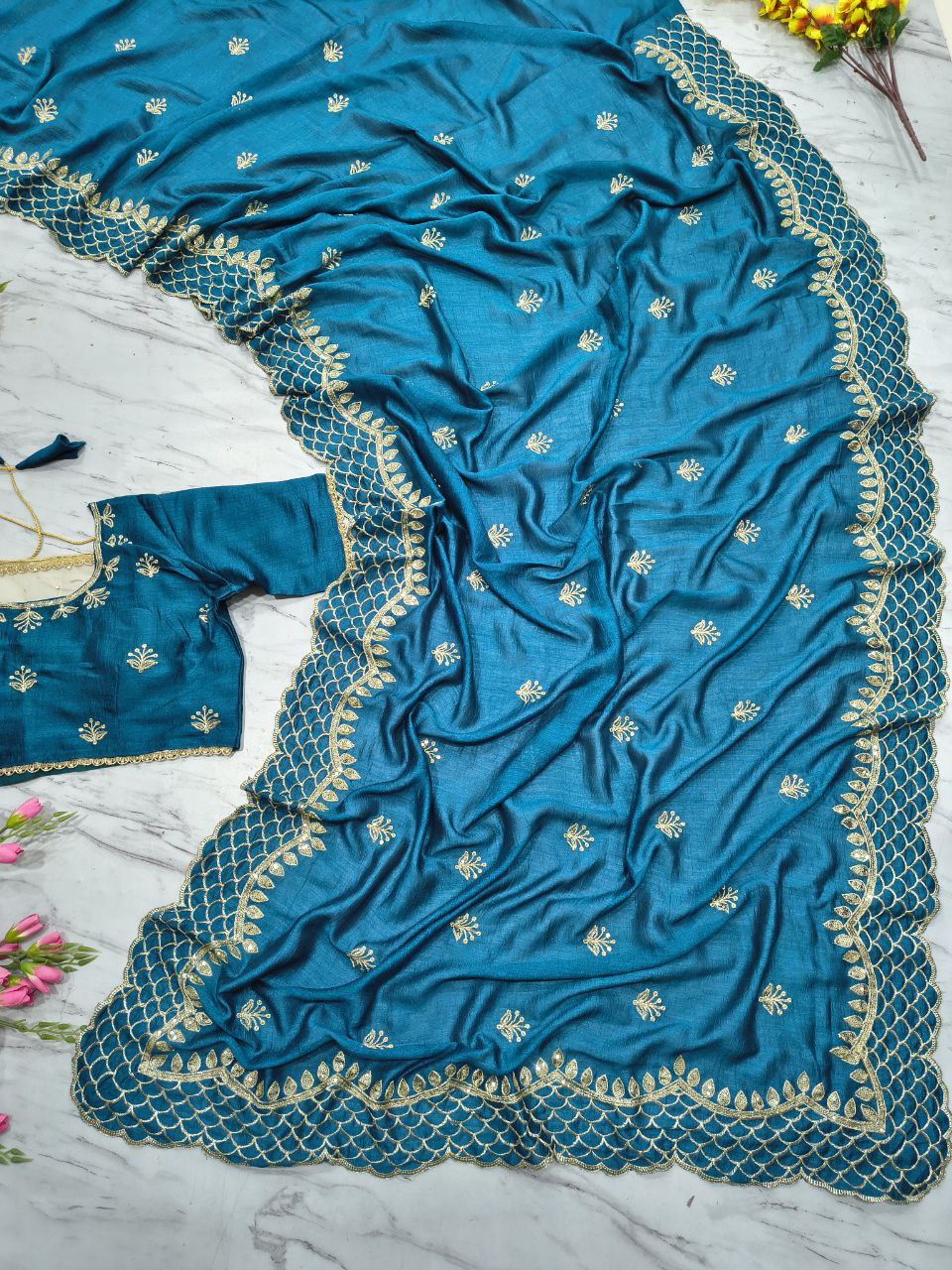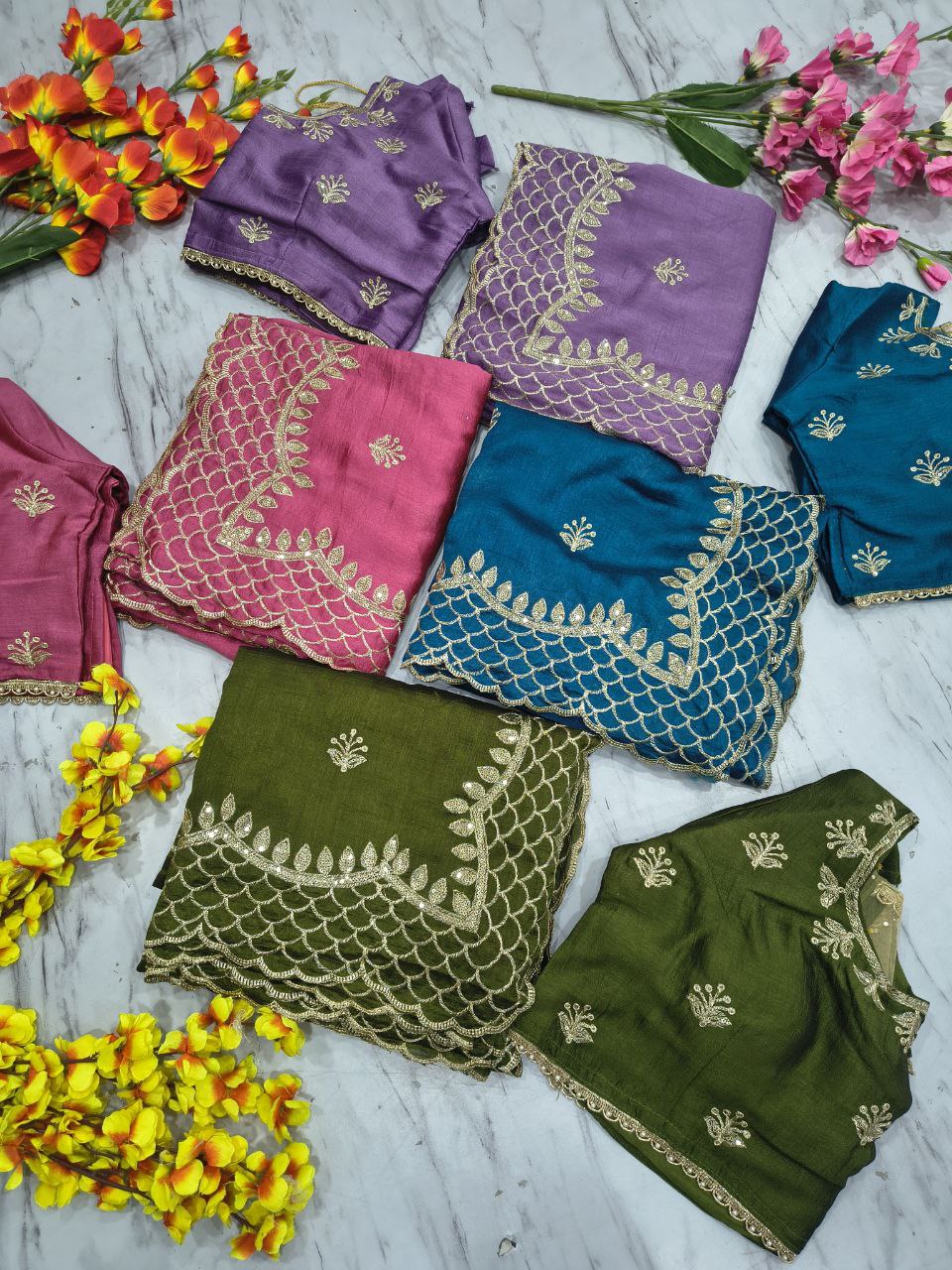 Blouse: Premium Soft Vichitra Silk Embellished With Beautiful Thread Embroidery, Beautiful 3mm Sequins Work (Full Stitched Size 42 With 2inch margin)