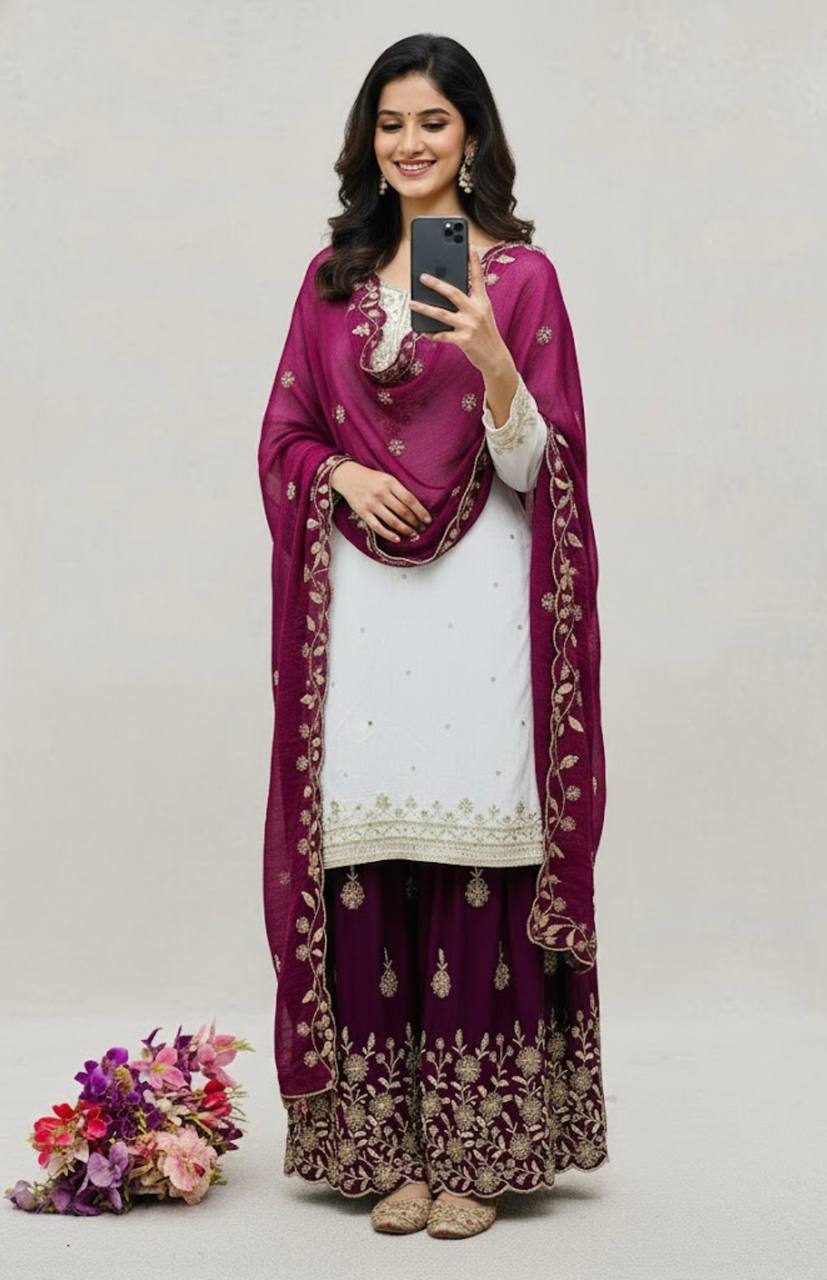 Wine and White Silk Embroidery Work Sharara Suit