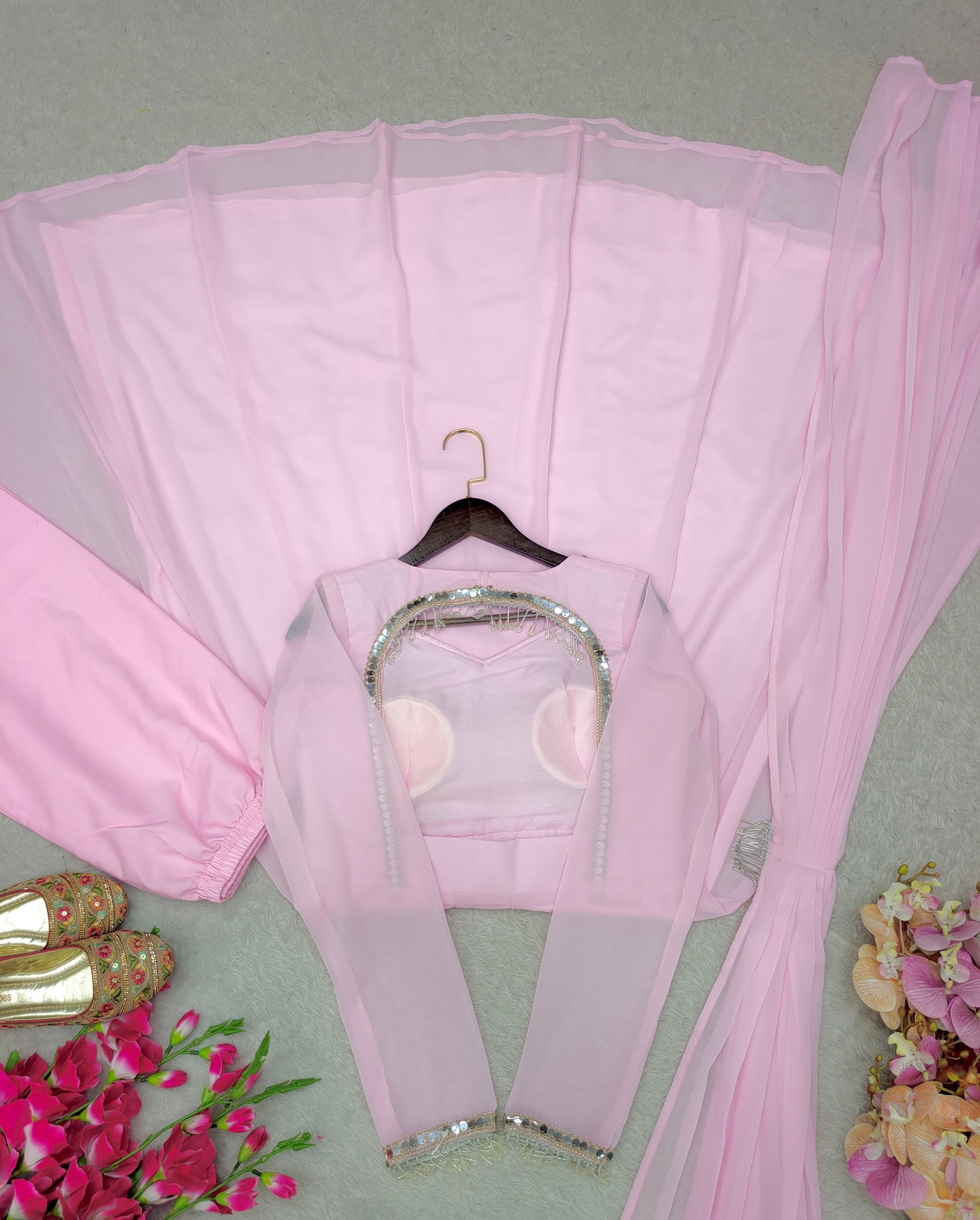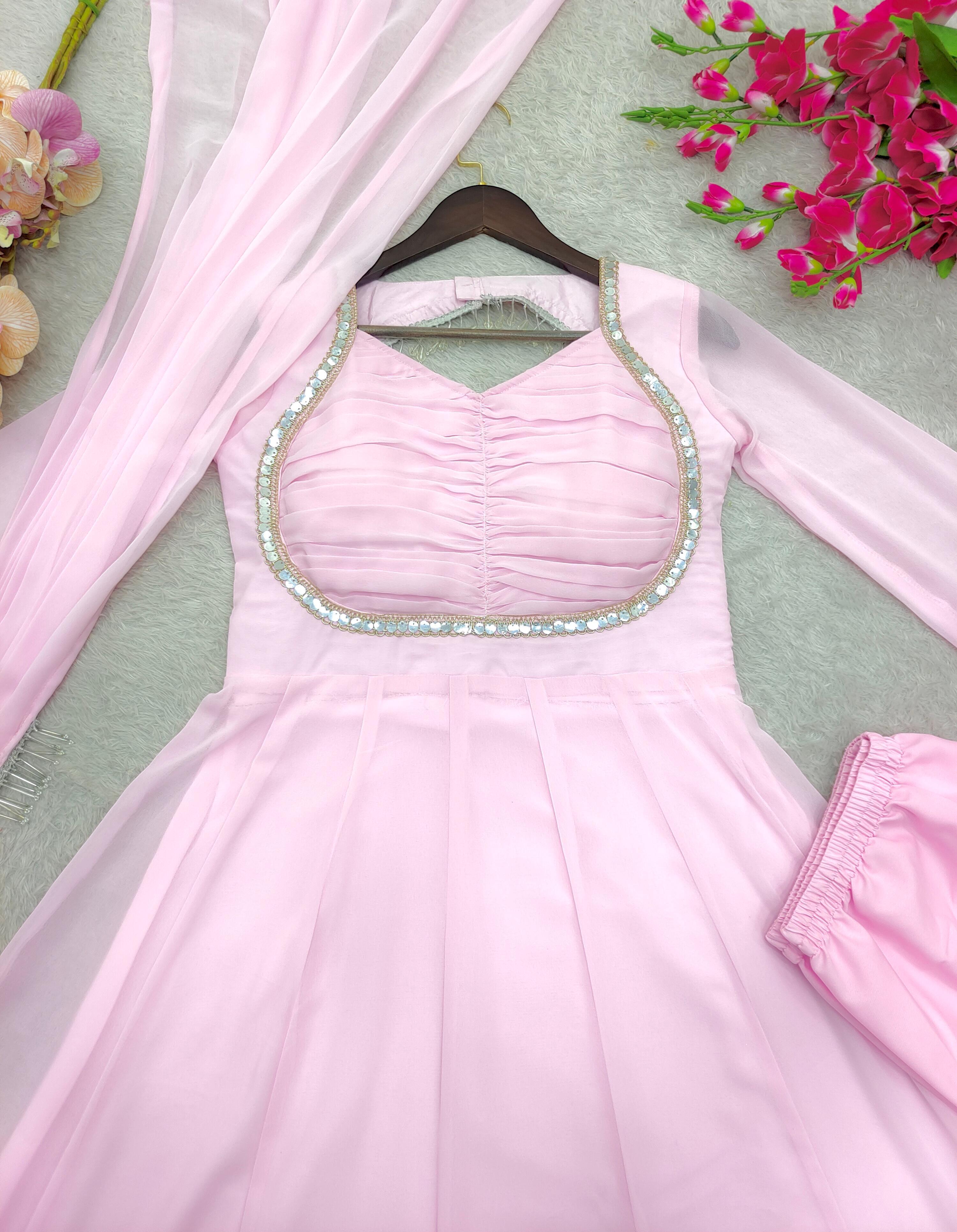 👗 Gown Fabric🩱: Pure Fox Georgette With Embroidery 9mm Sequences Less Work With Full-Sleeves With (Attached Ped With Fancy Crizzy With Hand Work Moti Lees Work)