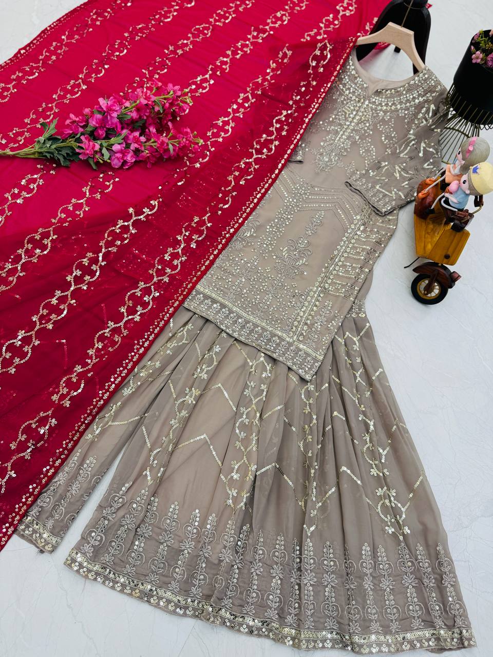 Exclusive Sequence Work Beige Color Sharara Suit With Pink Dupatta