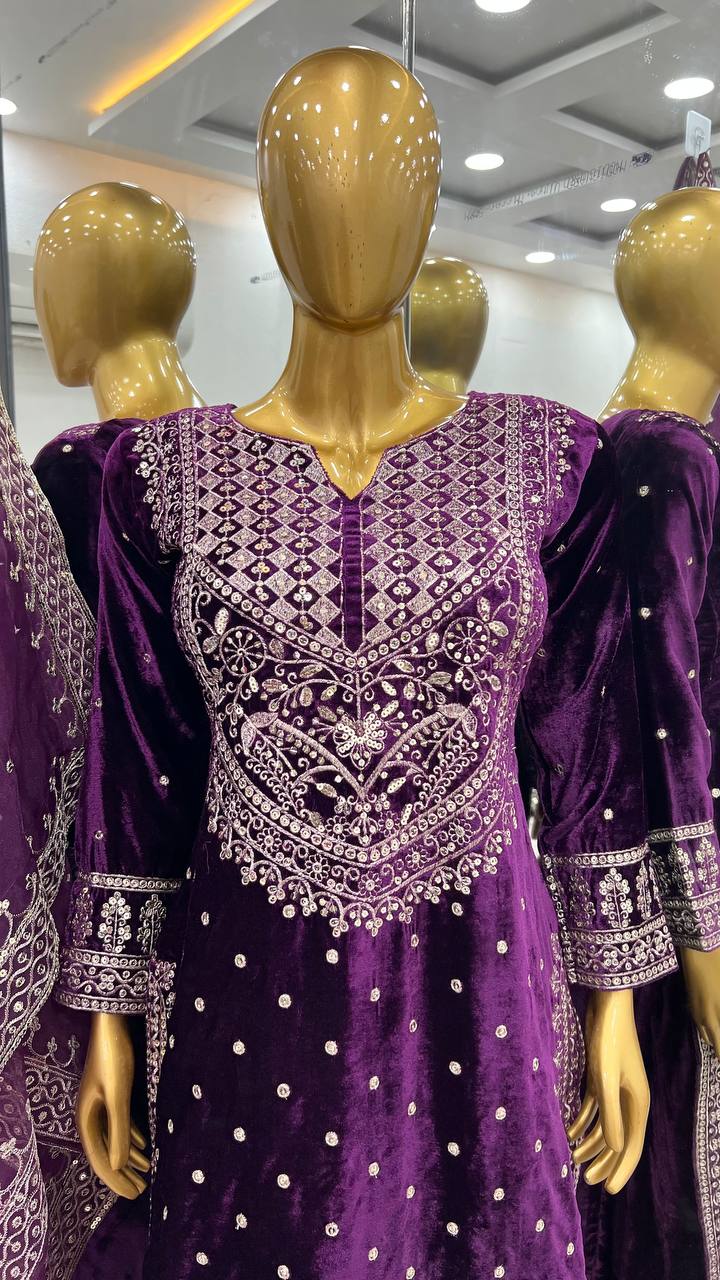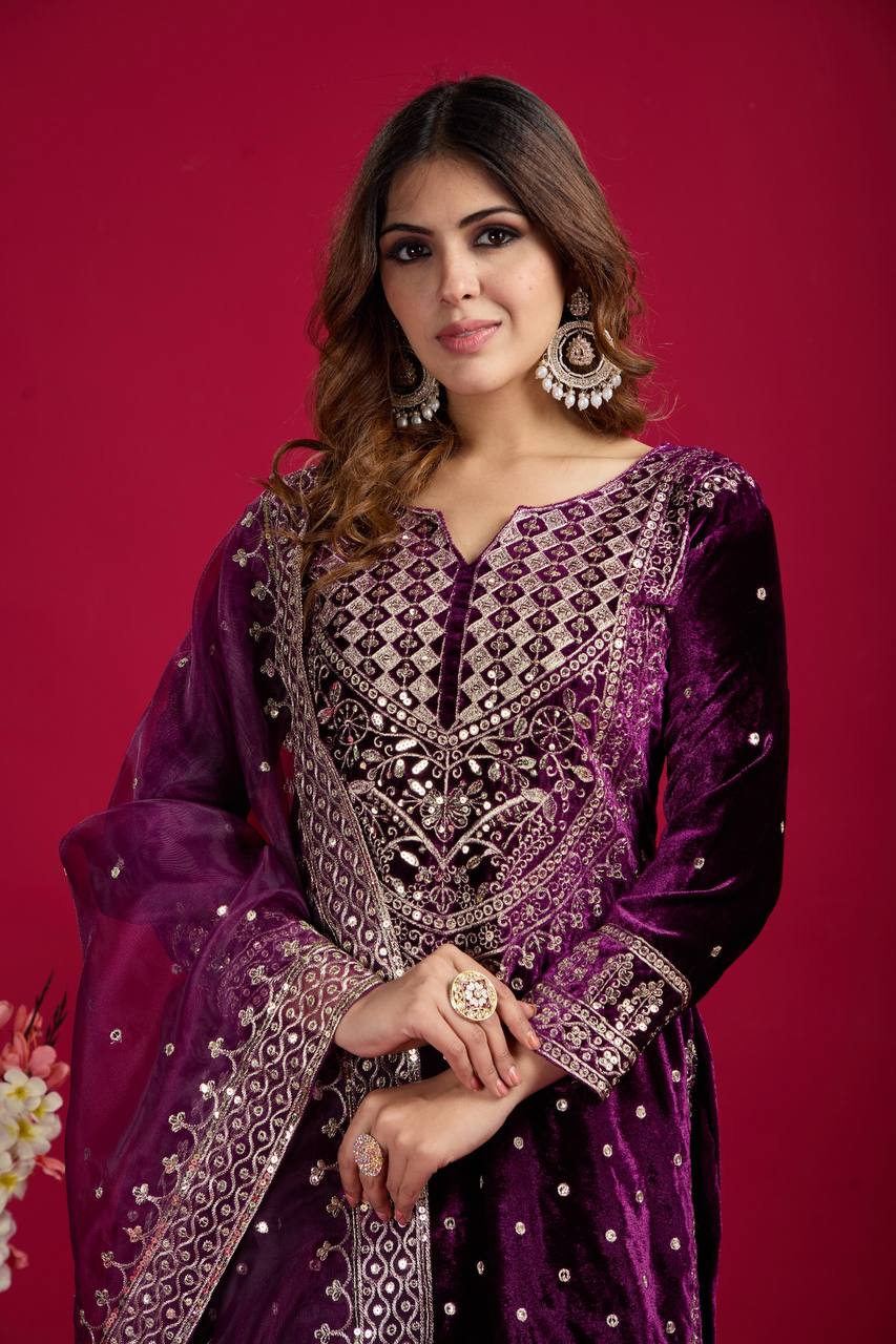 Fantastic Velvet Sequence Work Purple Color Top With Plazzo Suit