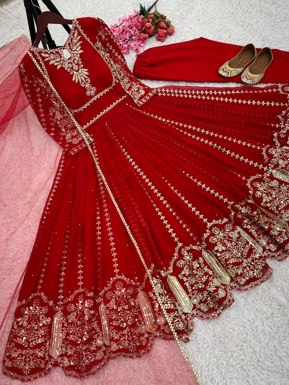 Fashionable Georgette Red Color Embroidery Work Anarkali Gown