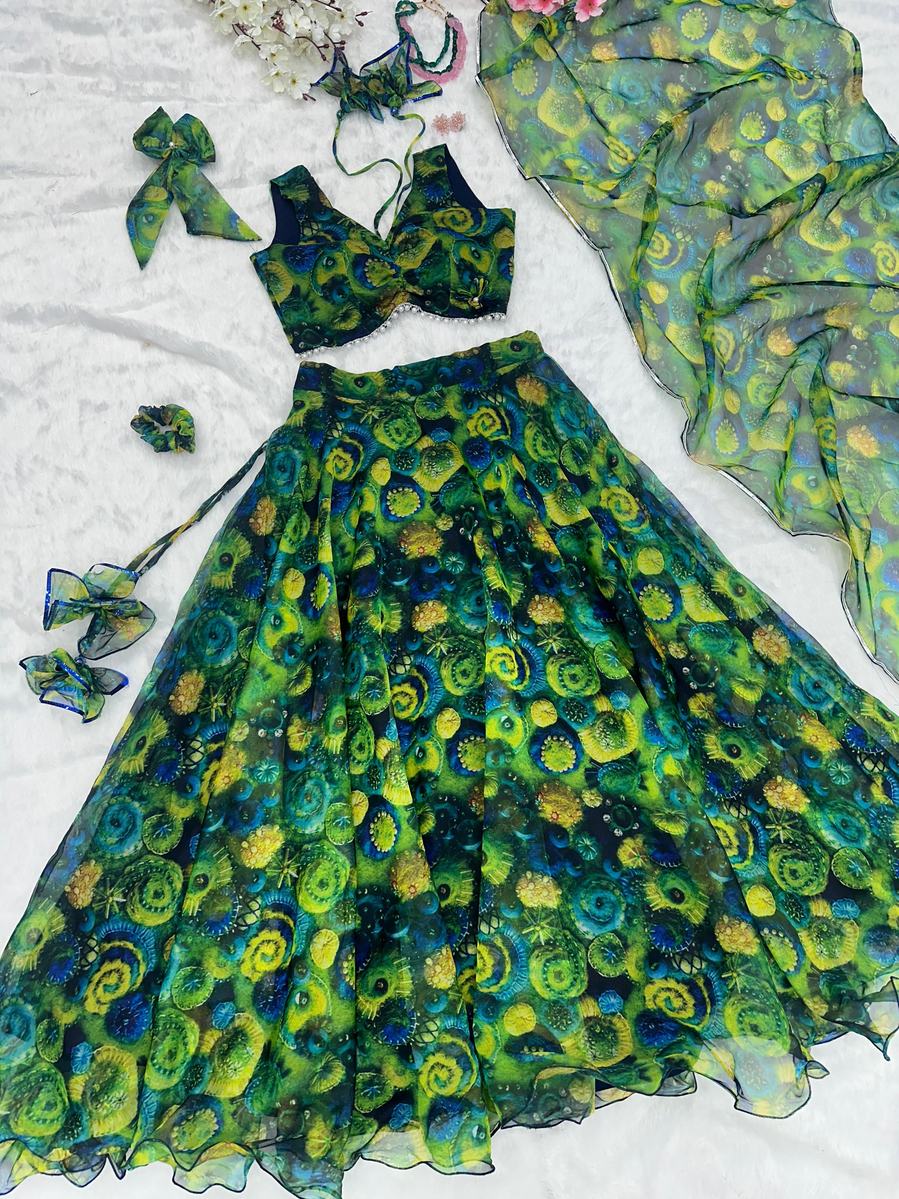 | Work | Â Floral Printed Lehenga. Â 8mtr Flair Lehnga With Canvas Patta And Adjustable Waist Dori |