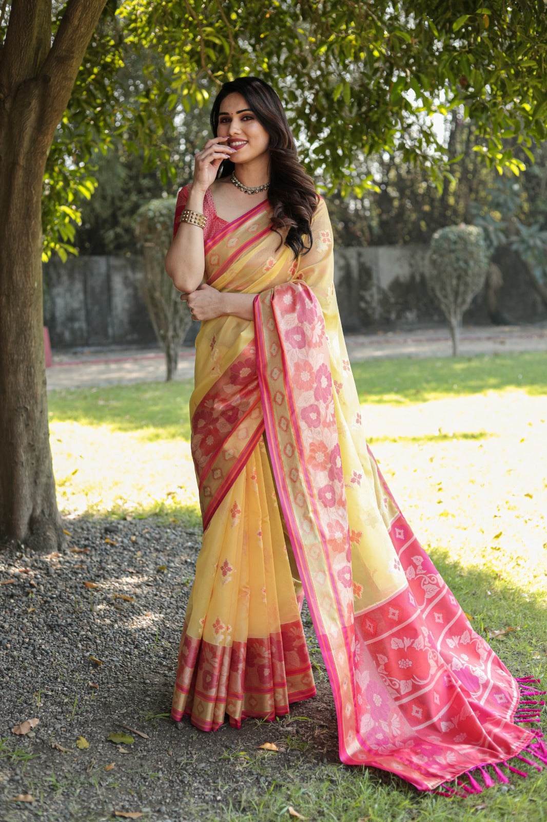 | Saree Work | Ikat  Concept Weaving Concept All Over Sarees And Ikat Weave Pallu With Tassels (She Is Soft, Flowy, Less In Weight, and Suitable For All Age) |