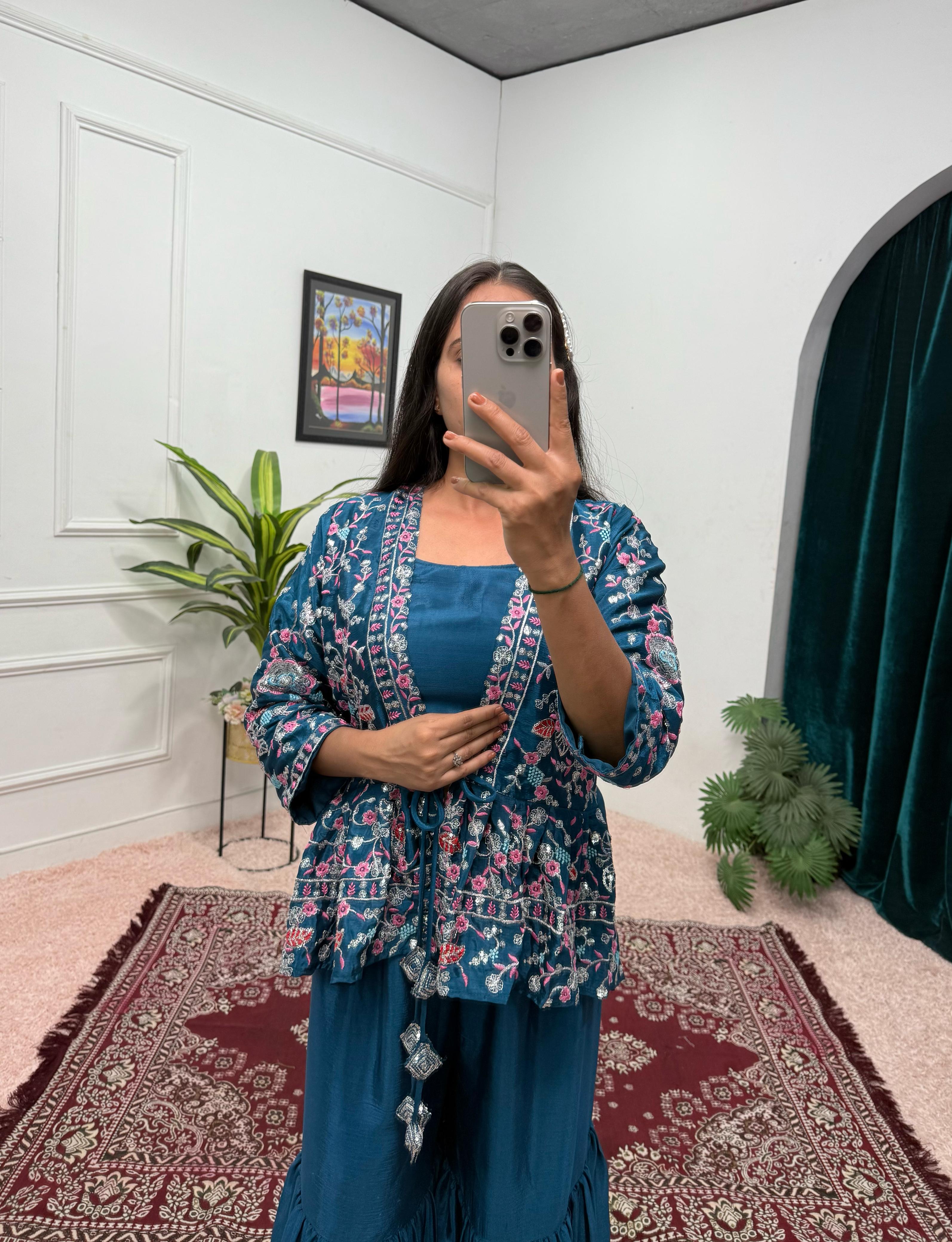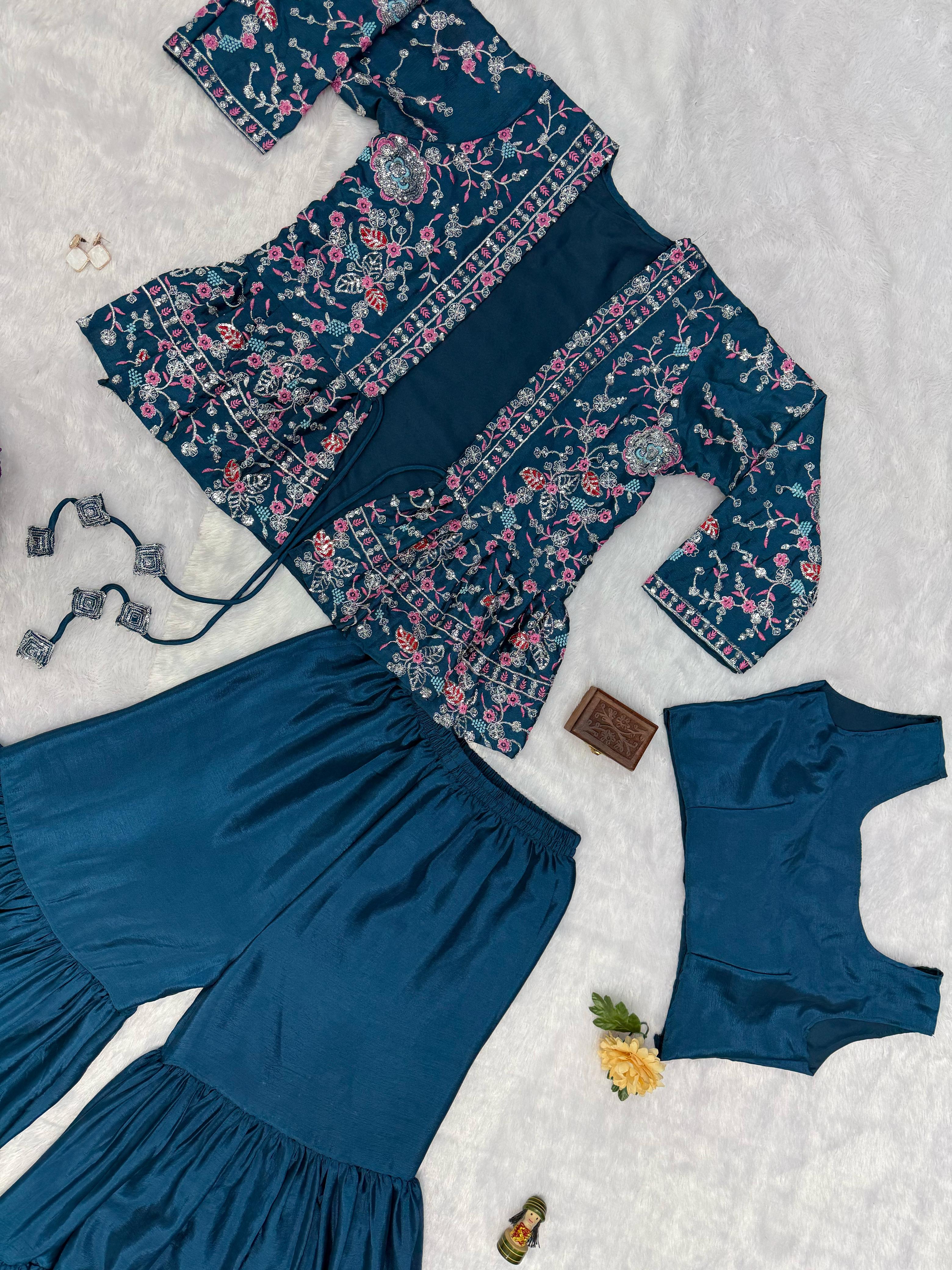 Function Wear Chinon Silk Teal Blue Color Sharara Suit