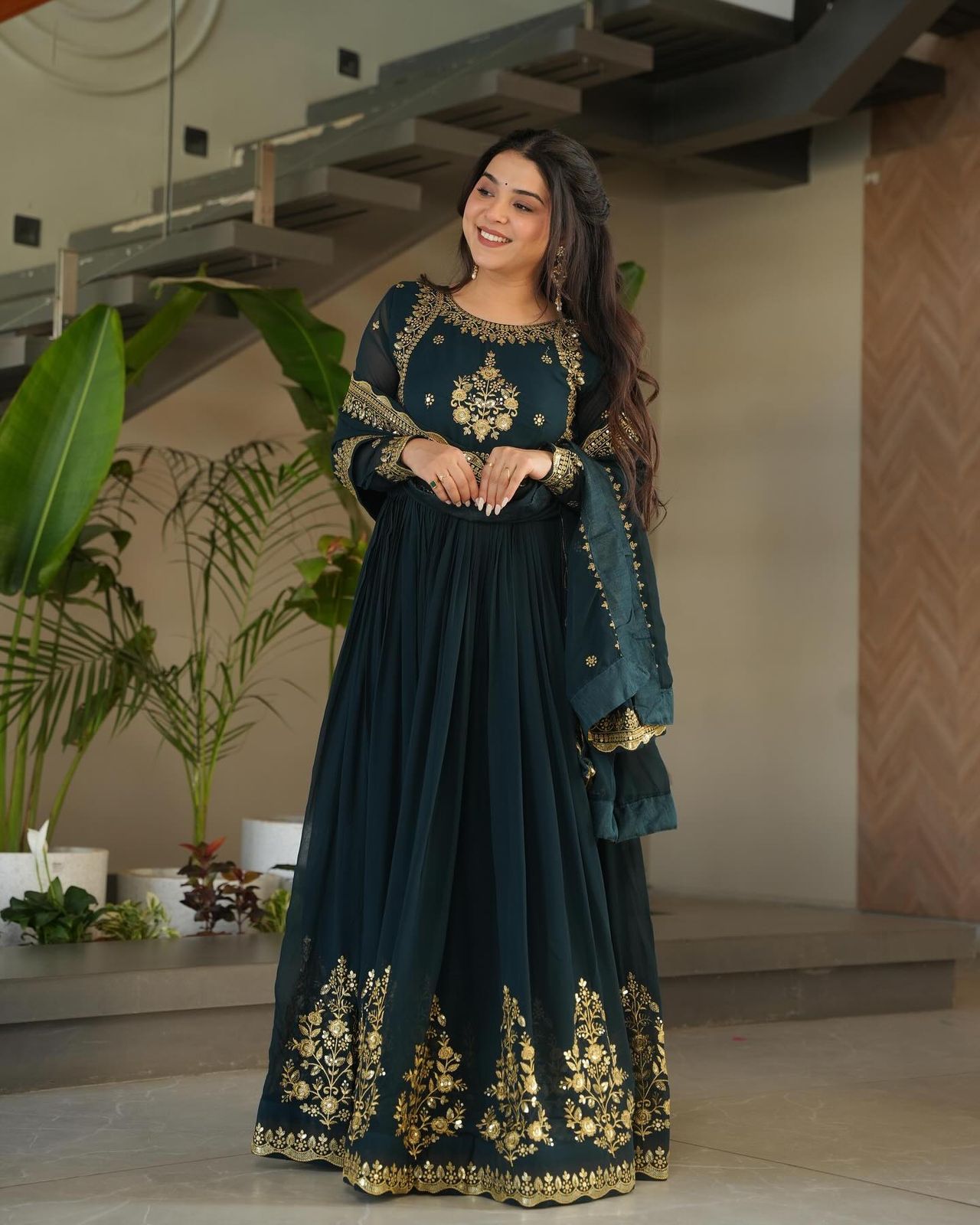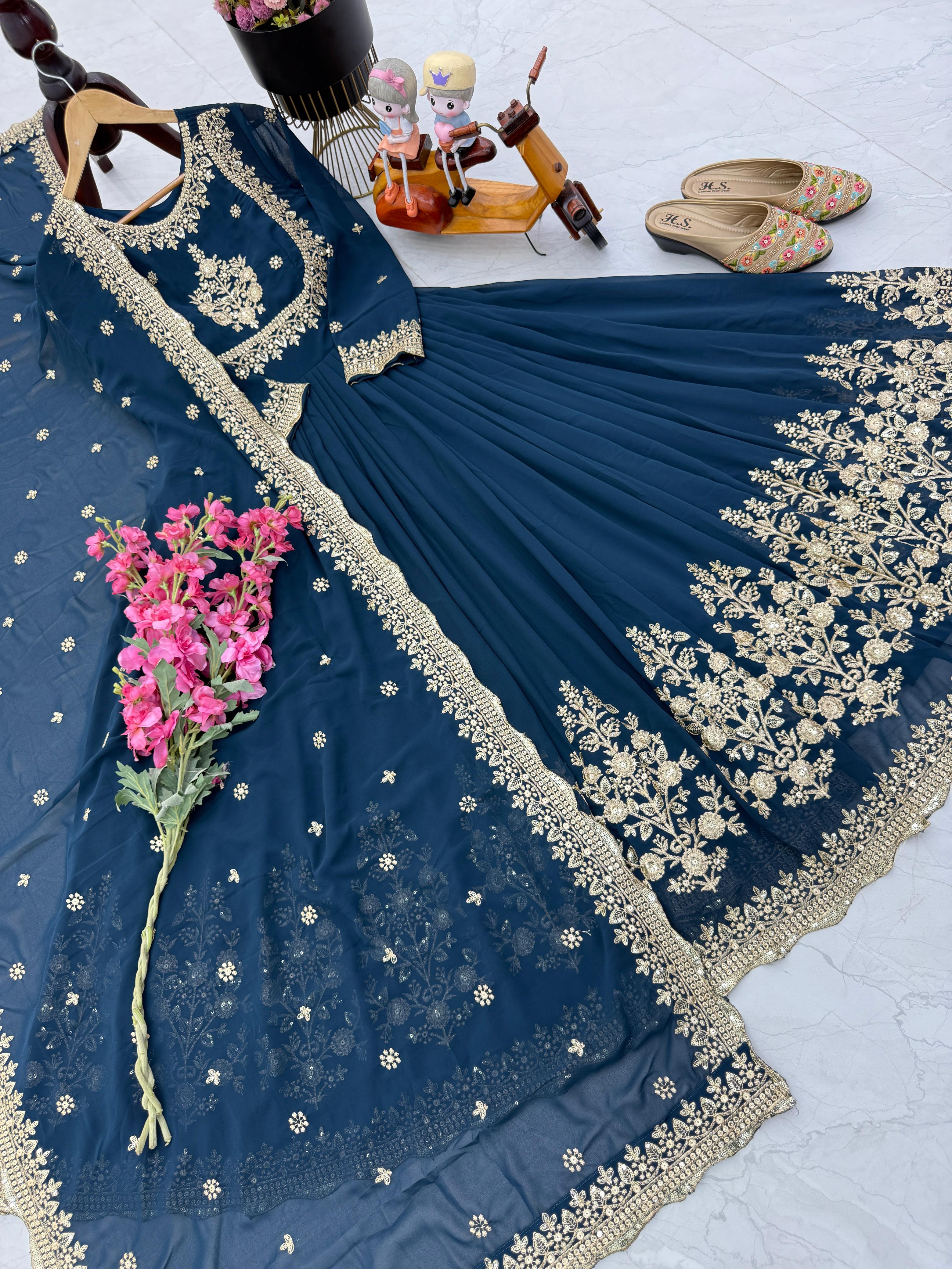 Glimmering Embroidery Work Long Teal Green Color Gown