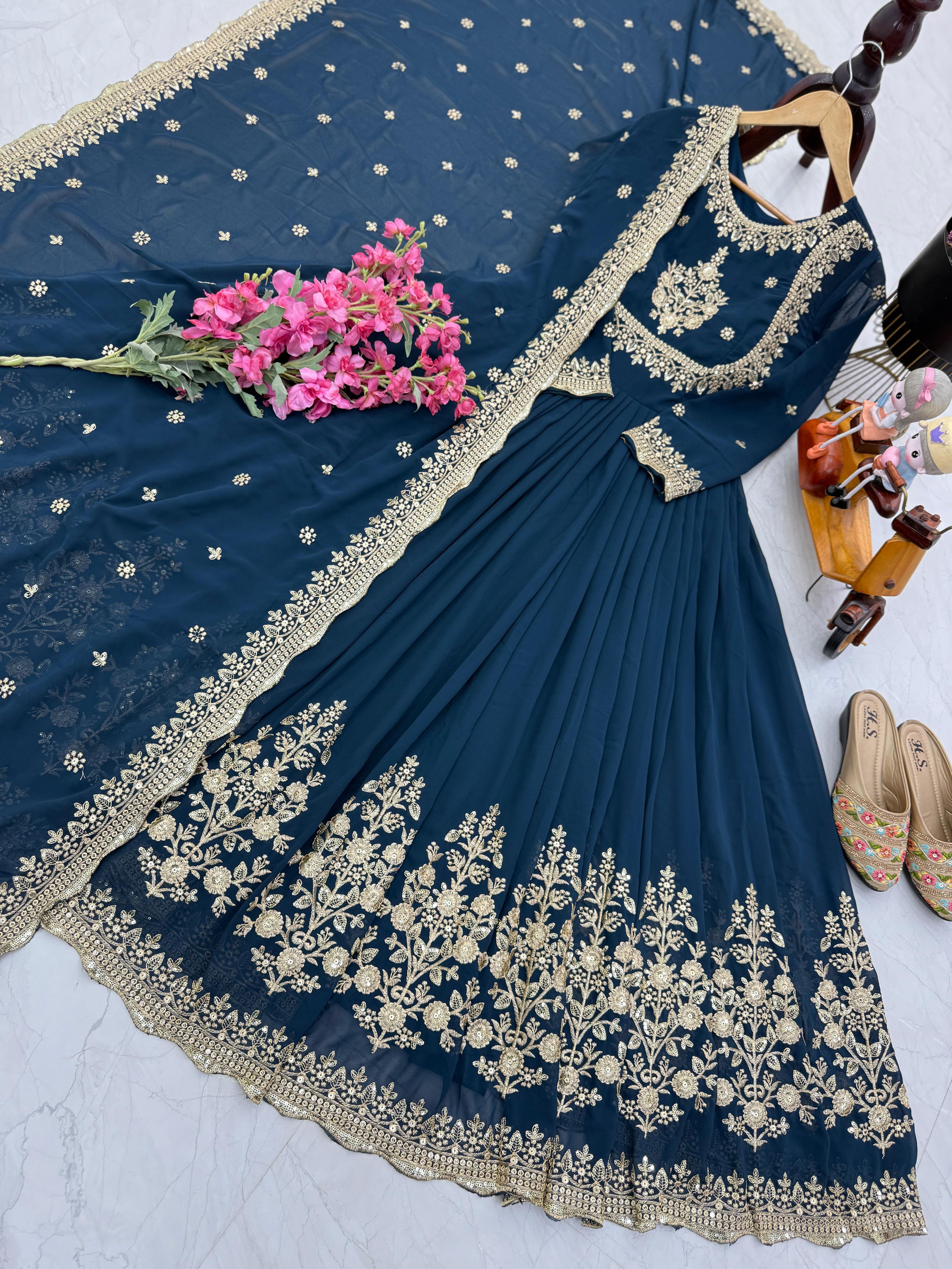 Glimmering Embroidery Work Long Teal Green Color Gown