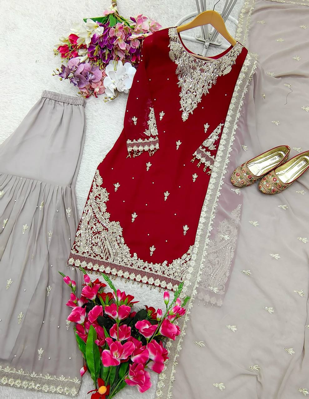 Gorgeous Embroidery Heavy Work Red Color Sharara Suit