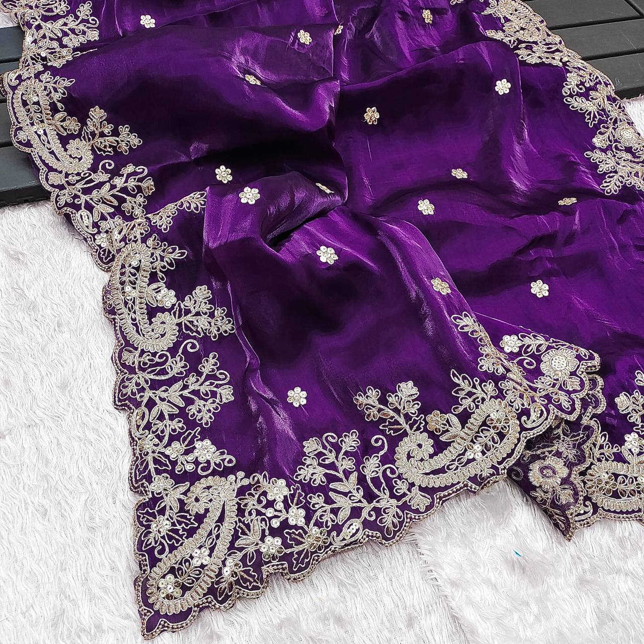 🥻 Sari Fabric: Premium Fendy Satin With Heavy Embroidery Codding & Sequins Work With Fancy CutWork Border