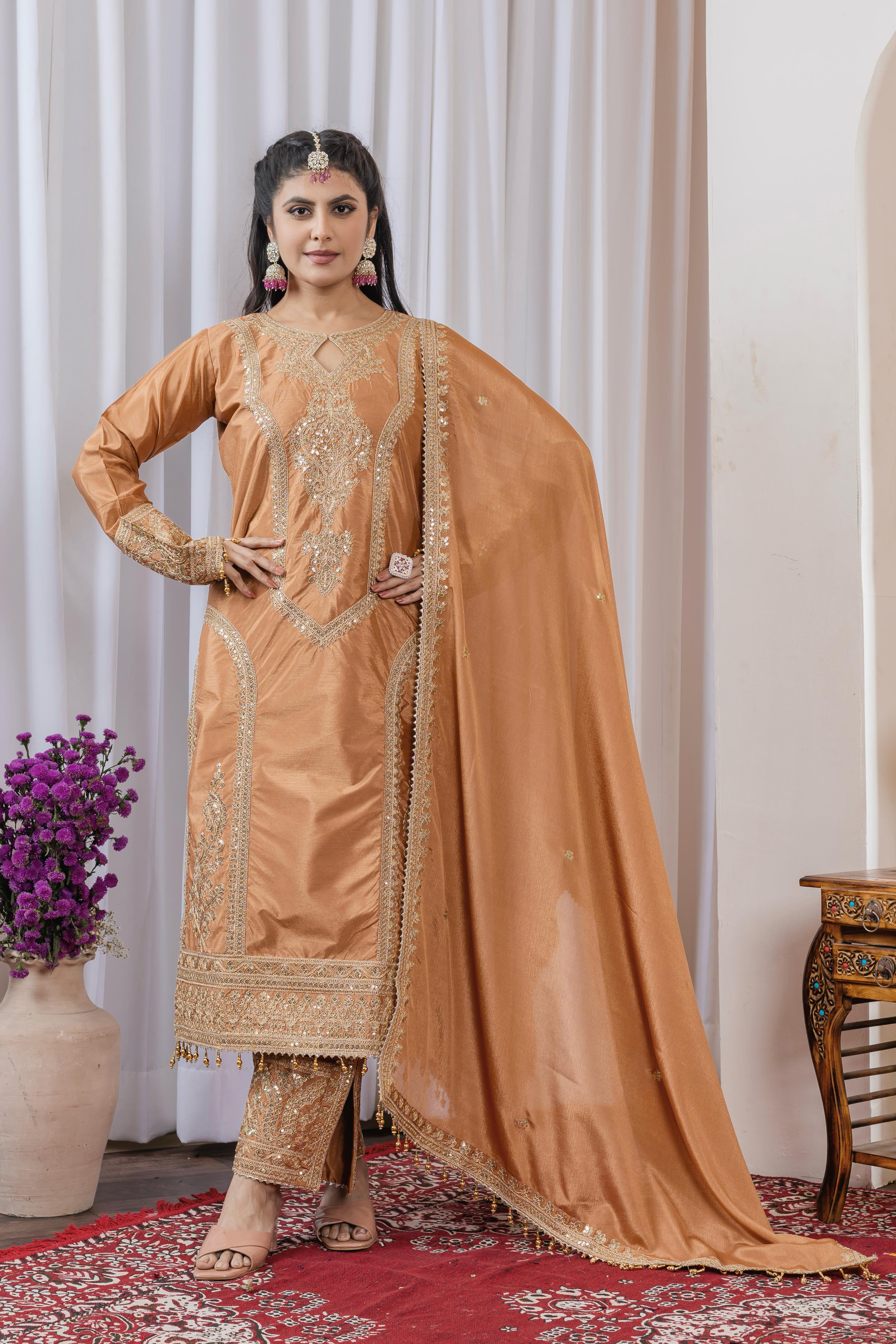 Imposing Chinon Silk Beige Color Top With Plazzo
