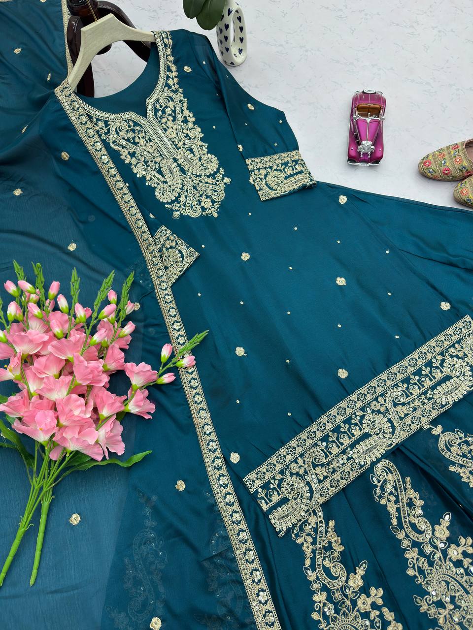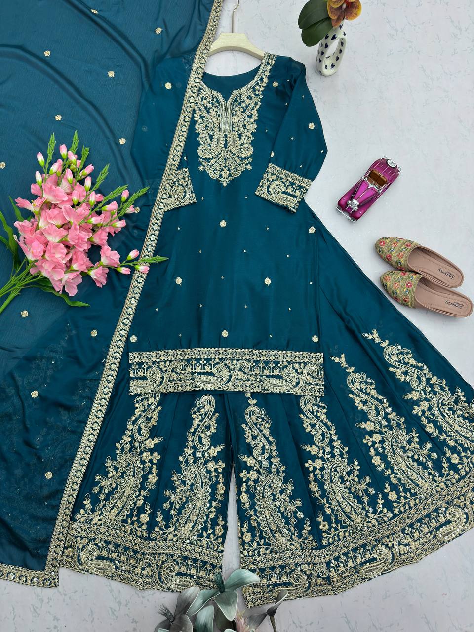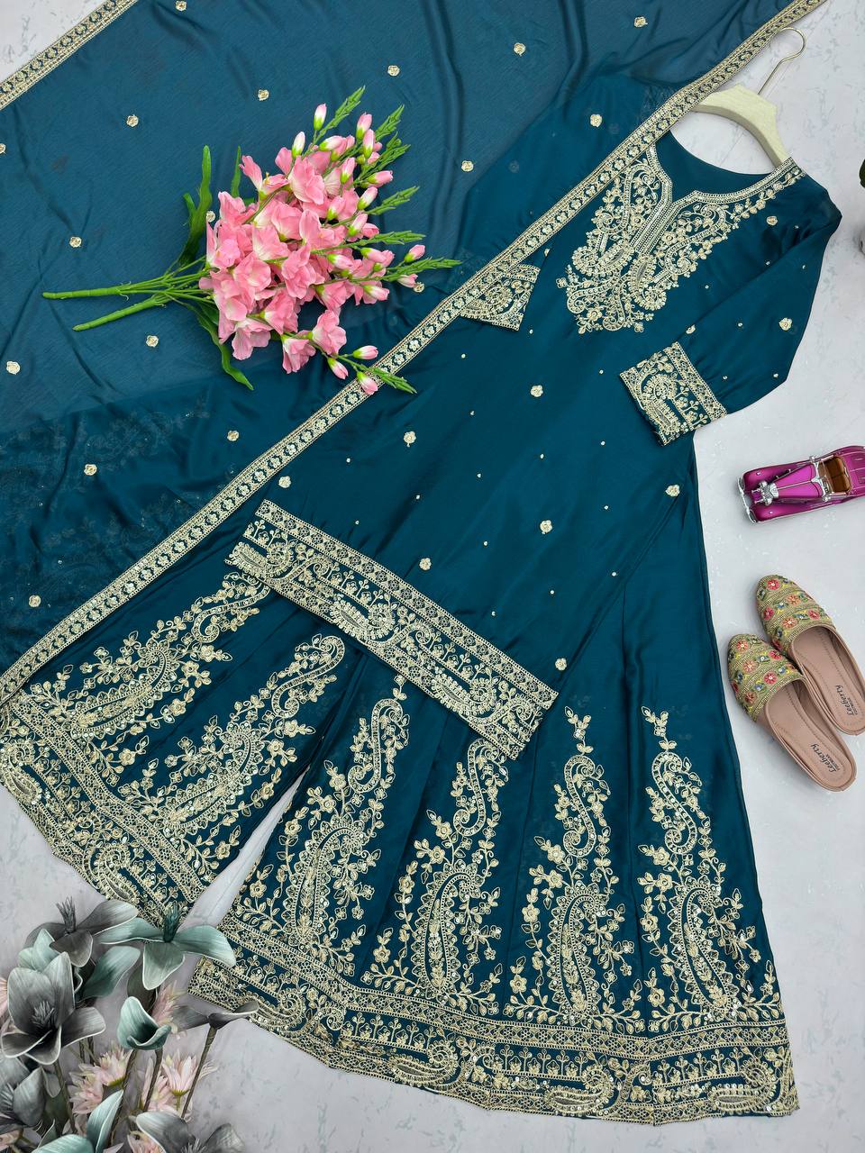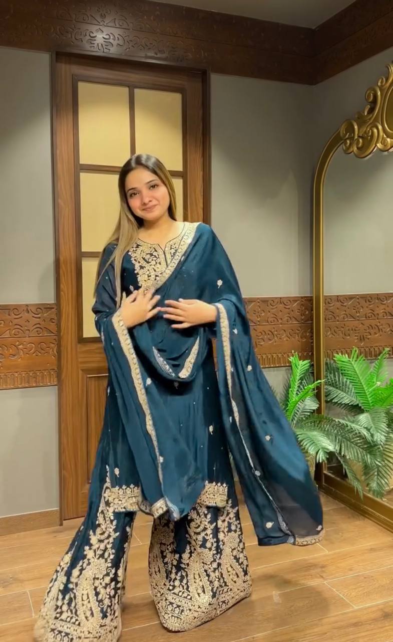 Lovely Blue Heavy Chinon Silk Embroidery Work Sharara Suit