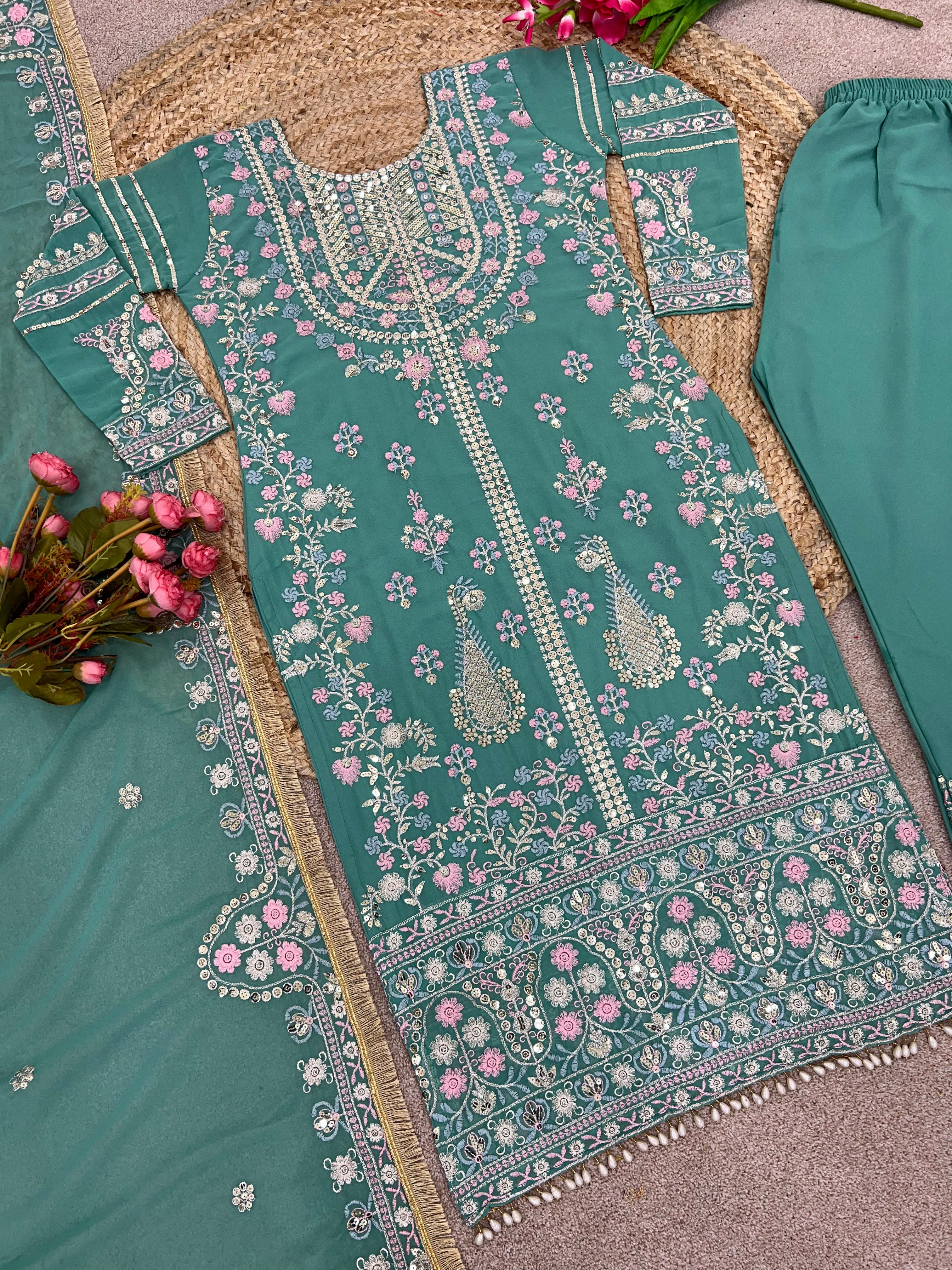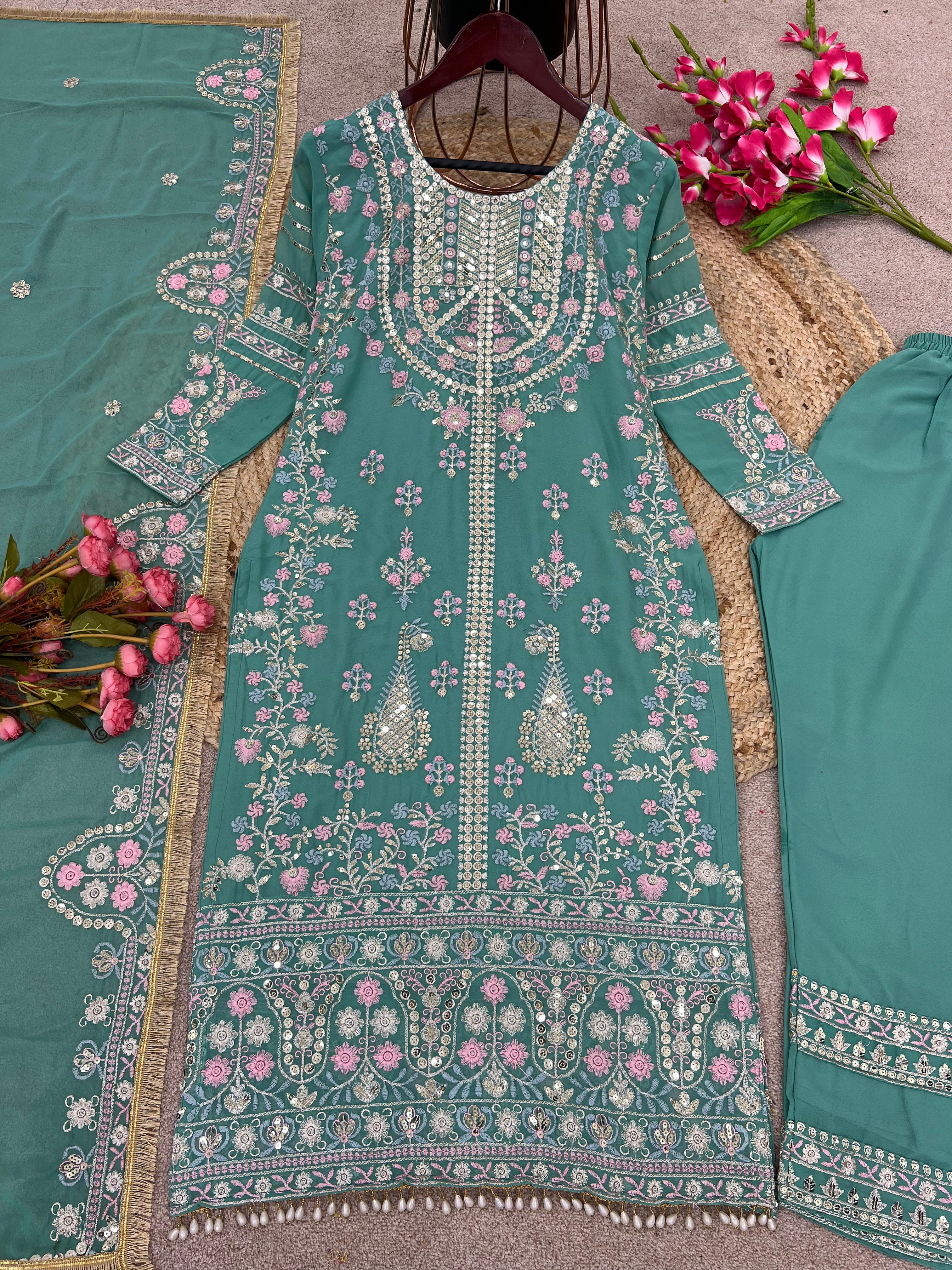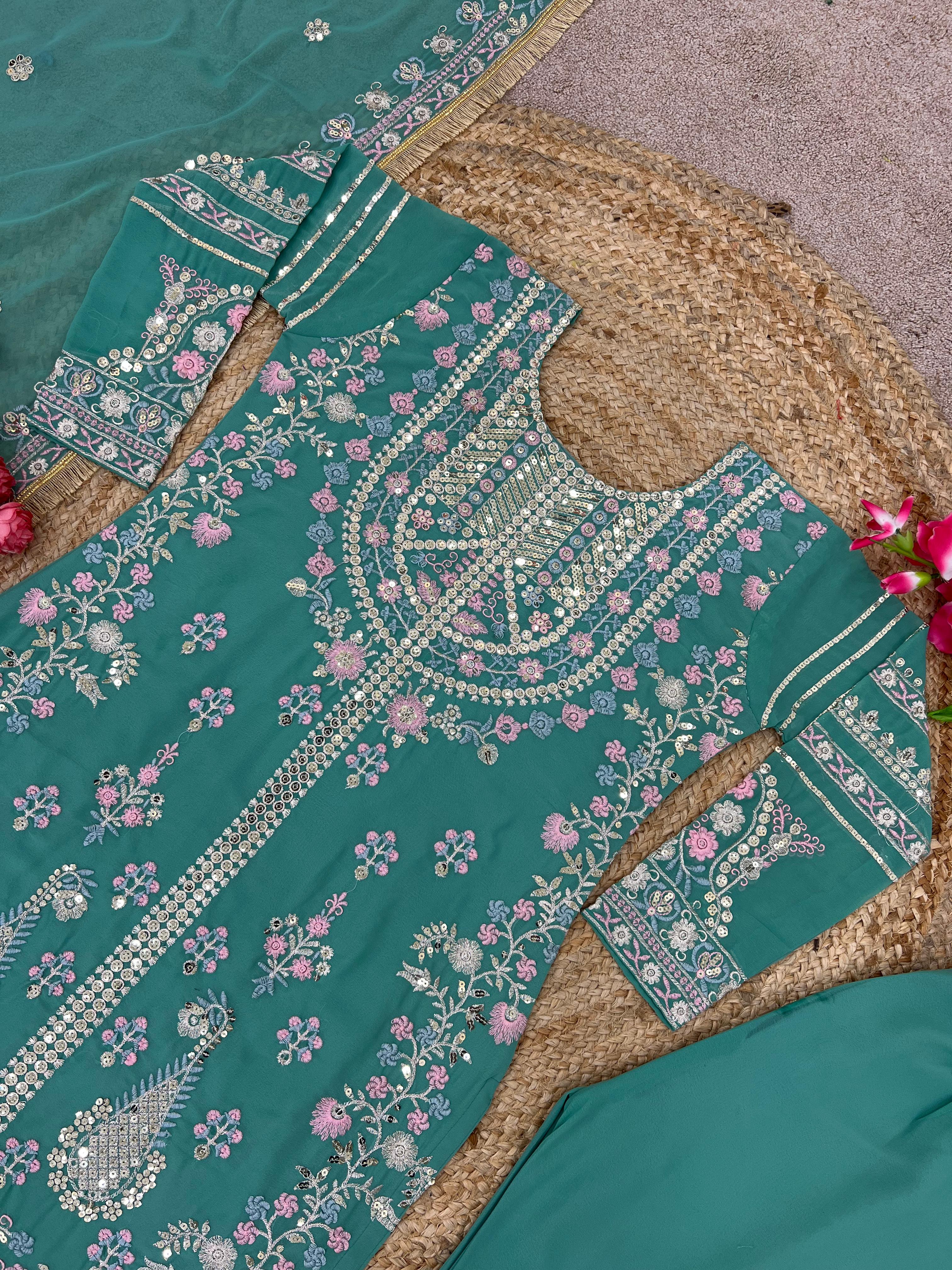 Mesmerizing Embroidery Sequence Work Rama Color Anarkali Suit