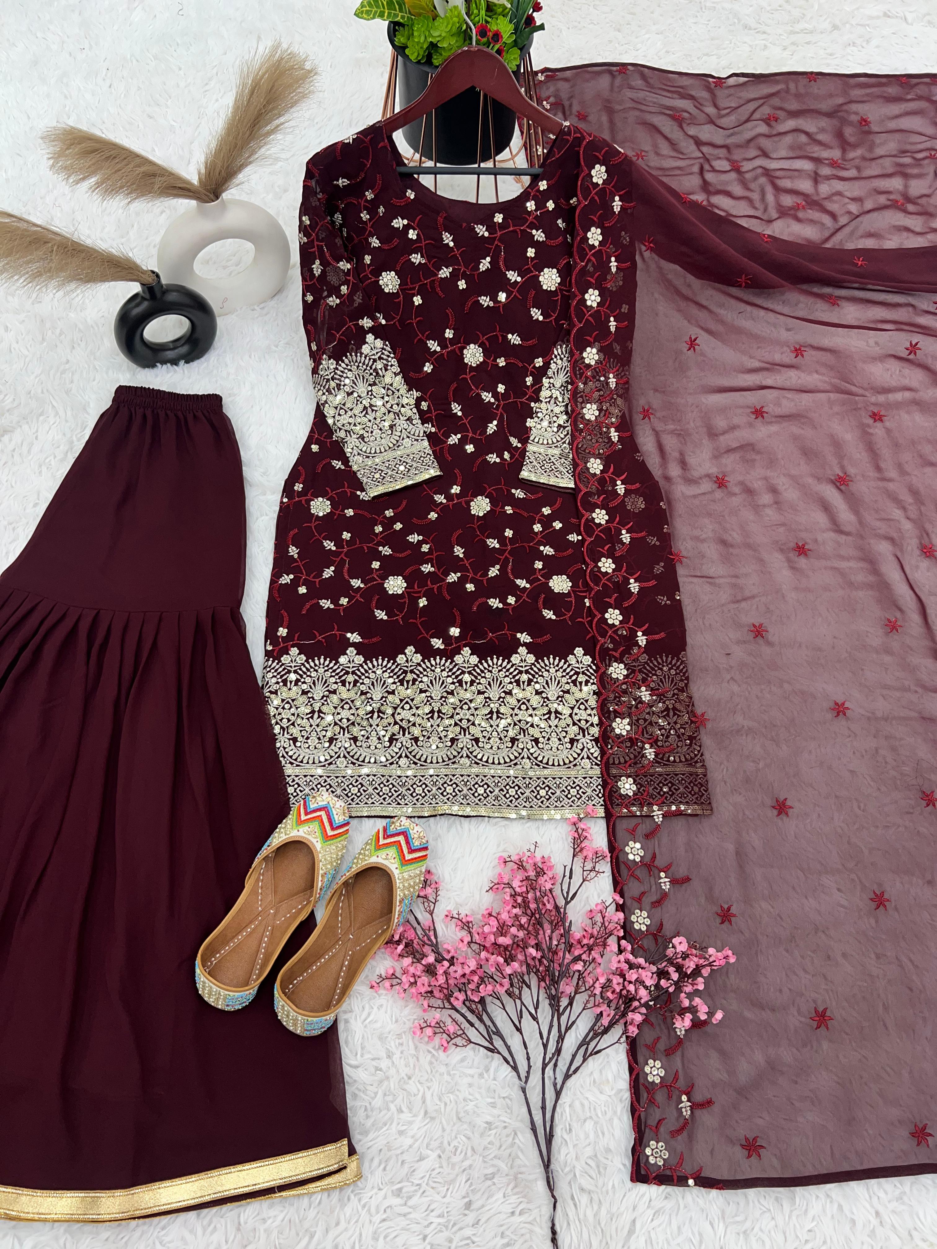 Mesmerizing Embroidery Sequence Work Wine Color Sharara Suit