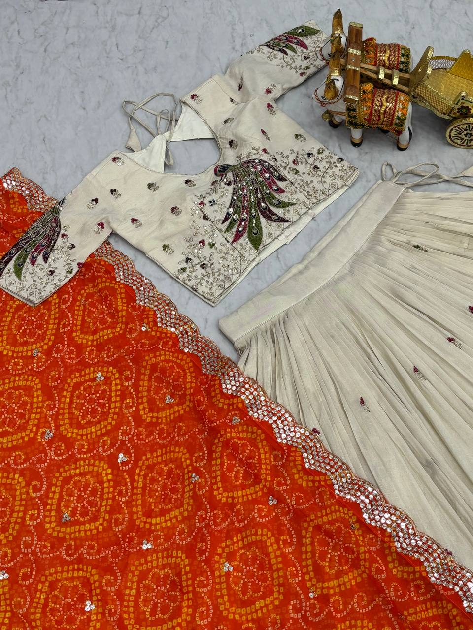 Multi Thread Work White Color Lehenga Choli With Orange Dupatta