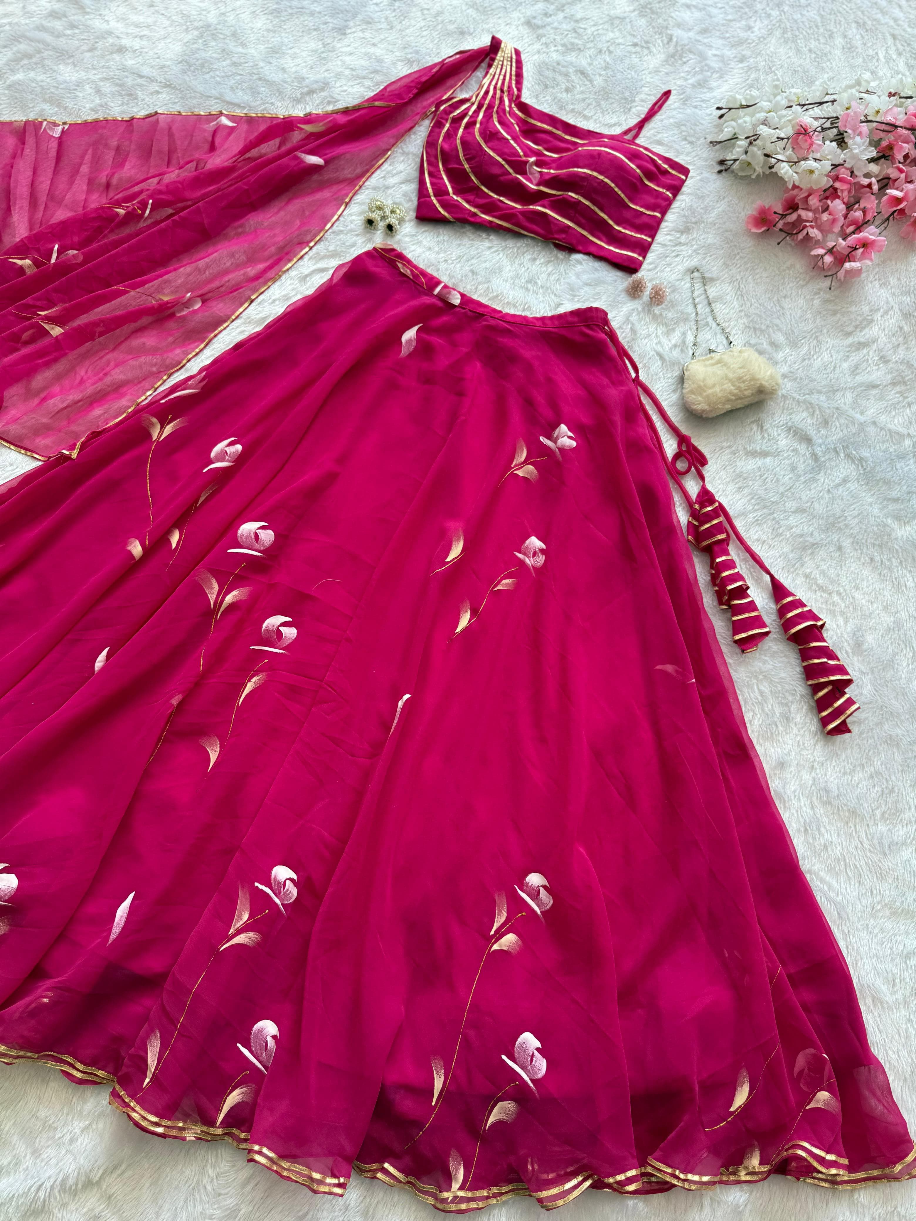 lehenga - Pure Georgette Hand Painted lehenga with attached Dupatta. 8mtr flair lehenga with canvas patta 🌸
