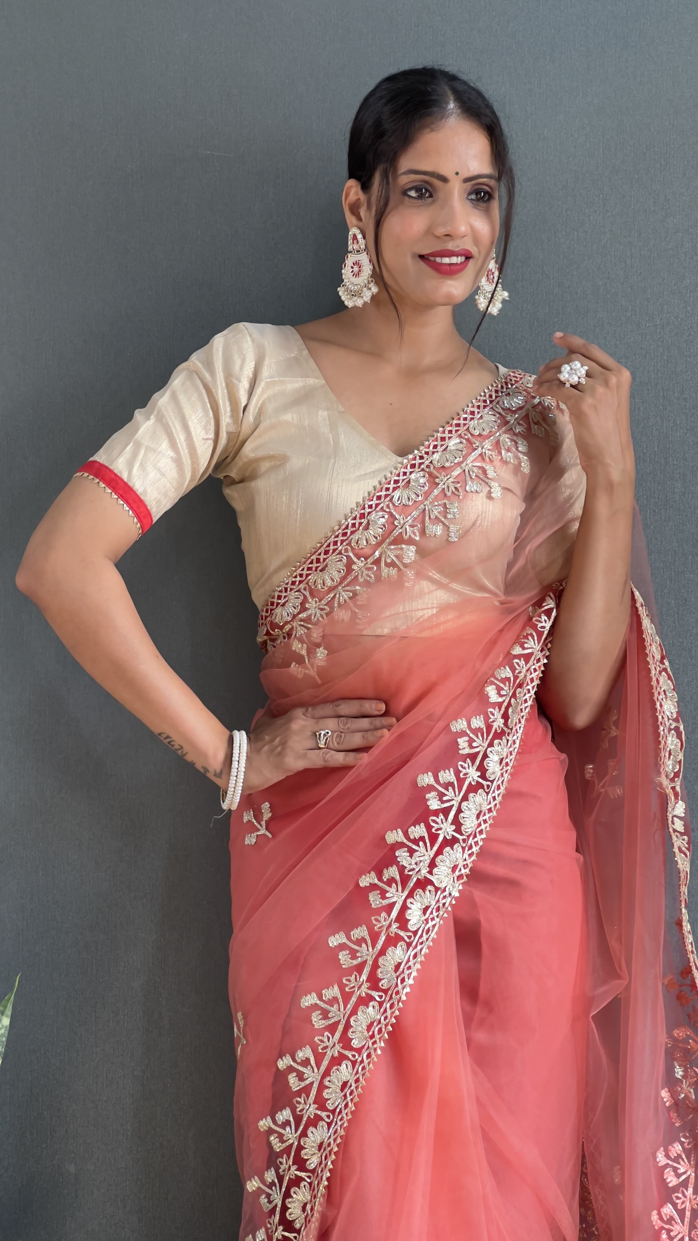 Saree : Premium Soft Padding Butterfly Net Embellished With Beautiful Hand Gota Work With Attached Inner( Ready To Wear )