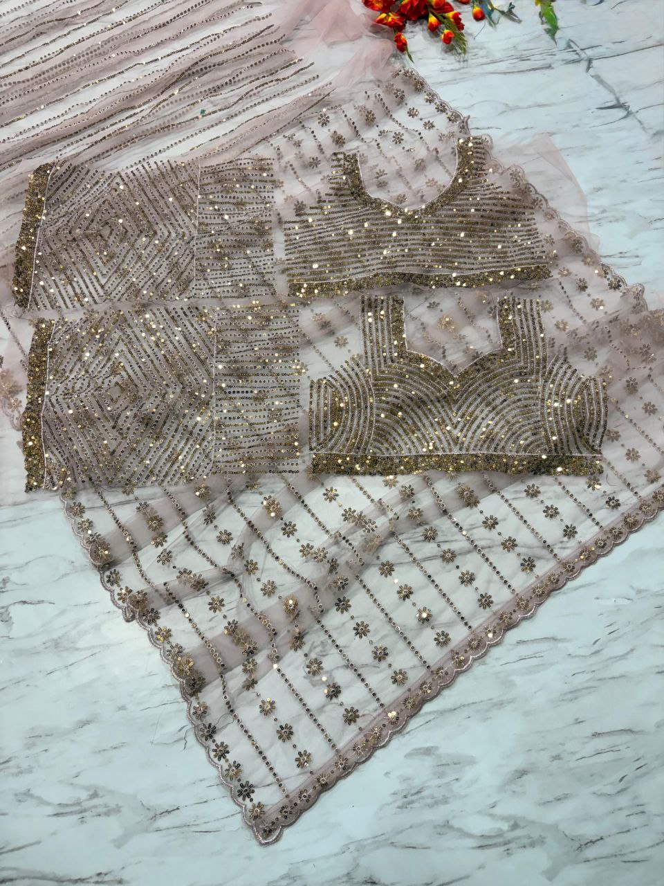 Blouse : *Premium Butterfly Net Embellished With Beautiful Sequence Work ,Both side work front and back with sleeves work*( Unstitched )