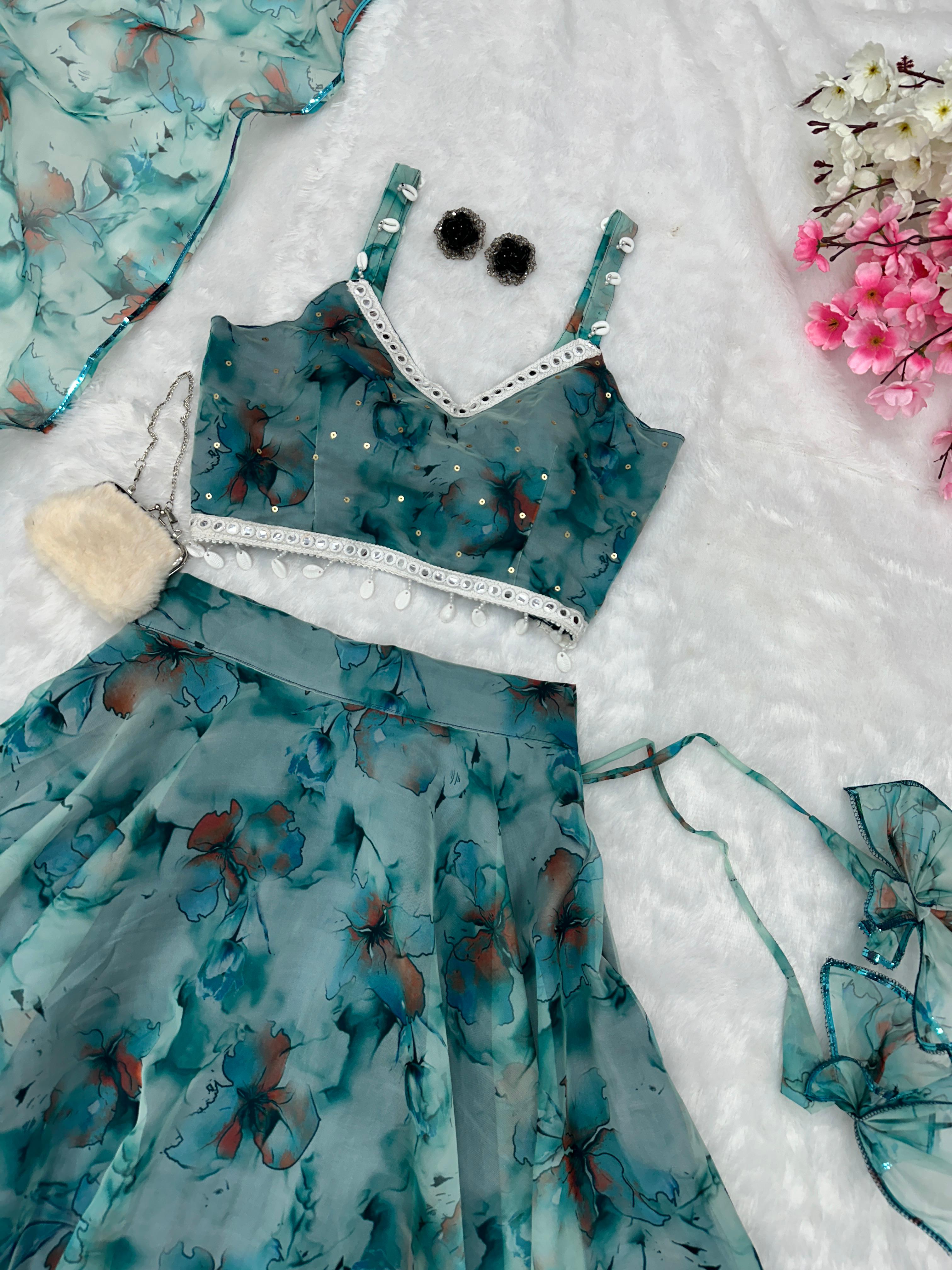 Peaceful Green Color Organza Digital Printed Lehenga Choli