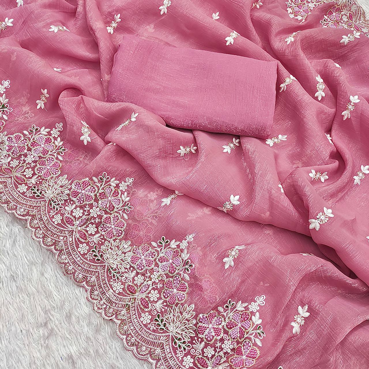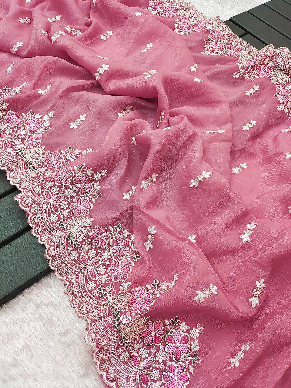 🥻 Sari Fabric : Premium Crunchy With Heavy Embroidery Threads 🧵 & Sequins Work With Fancy CutWork Border
