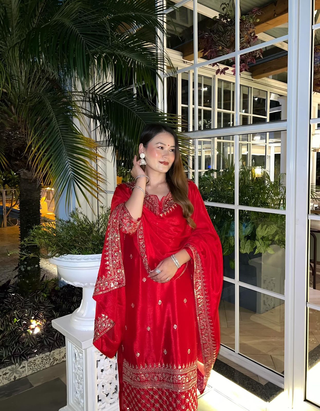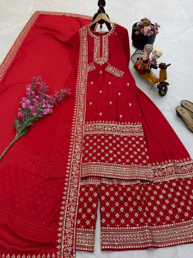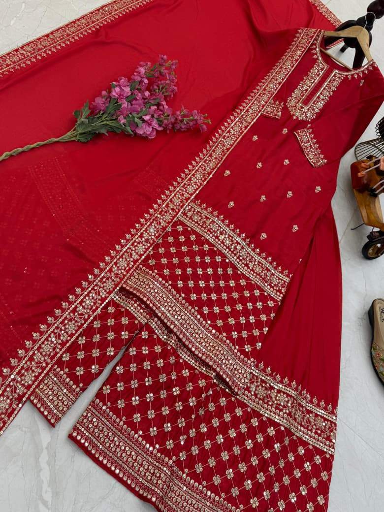 Ravishing Red Chinon Silk Embroidery Sharara Suit