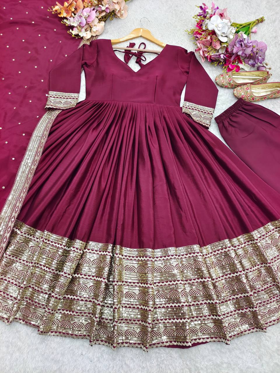*Gown Fabric* ย : Pure Cinon Silk With Heavy Embroidery 5mm Sequence Work With Full-Sleeve With Latkan Dori