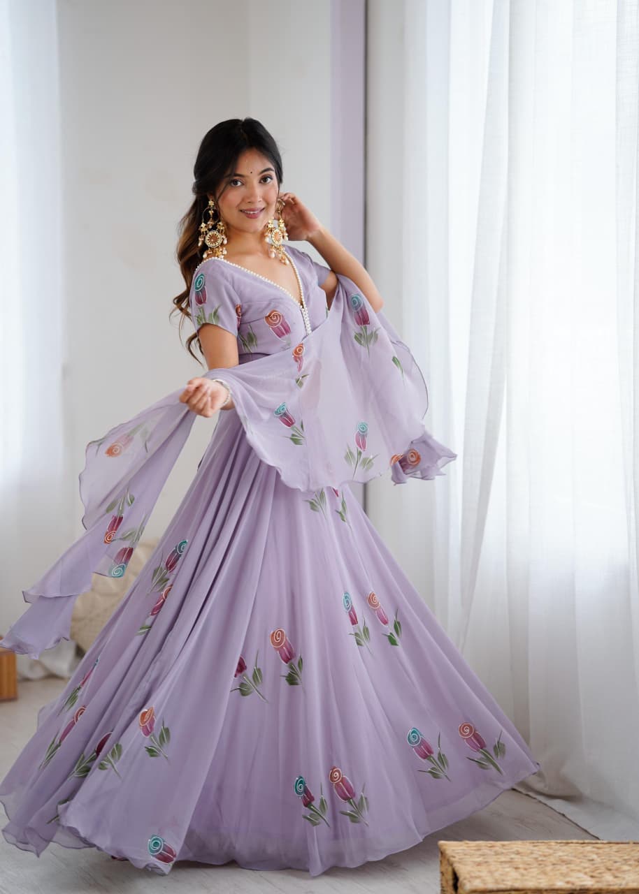 Lehenga: Pure Georgette Hand Painted lehenga. 8mtr flair lehenga with canvas patta