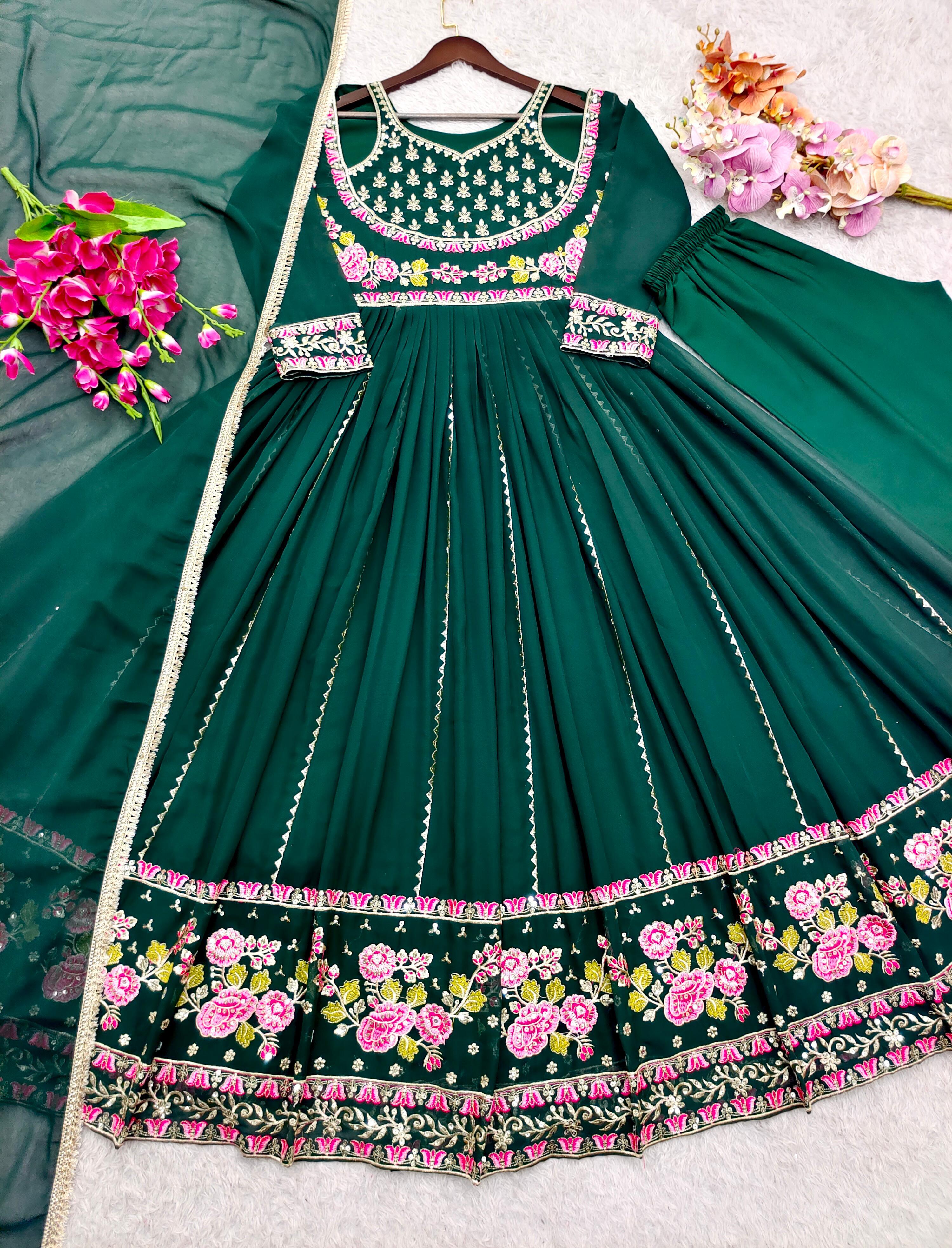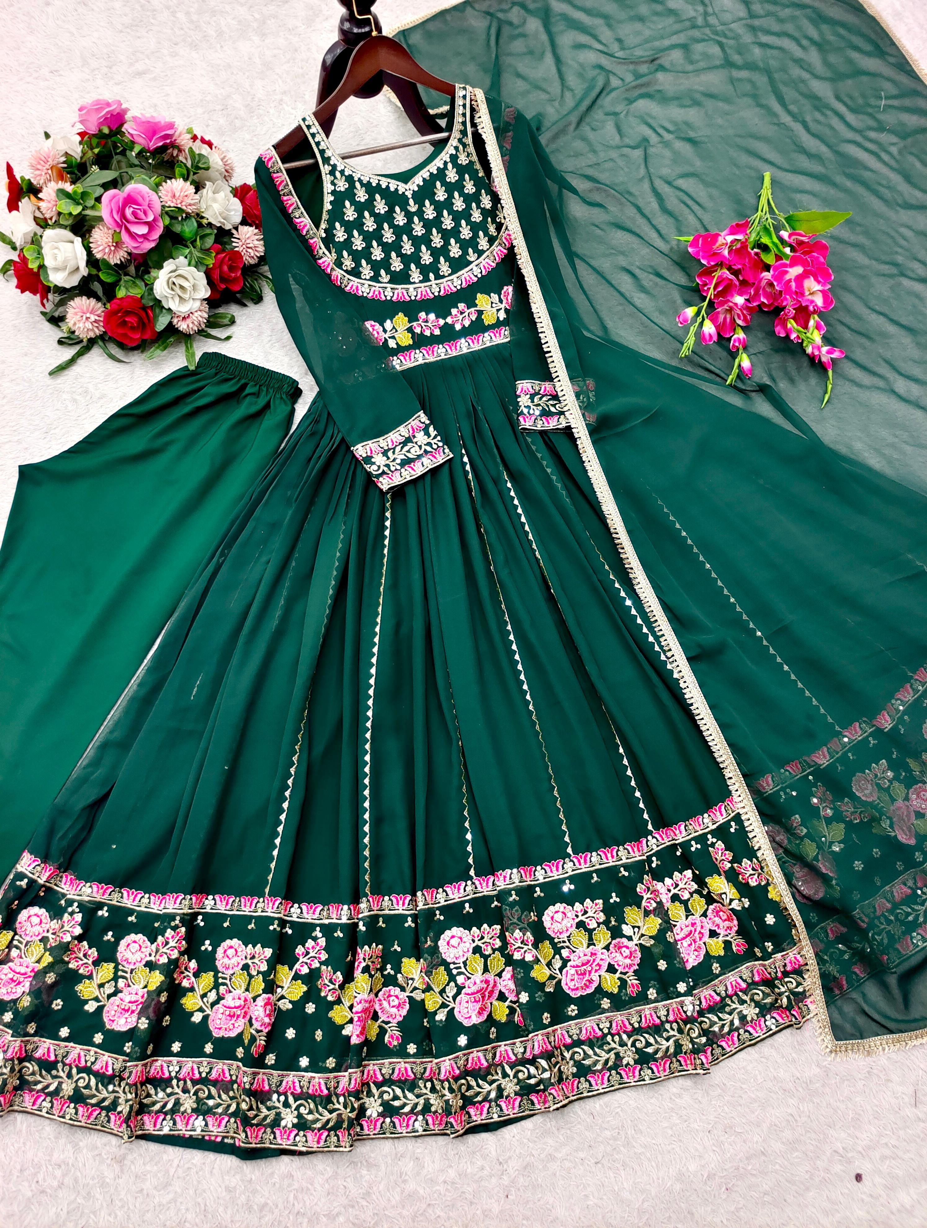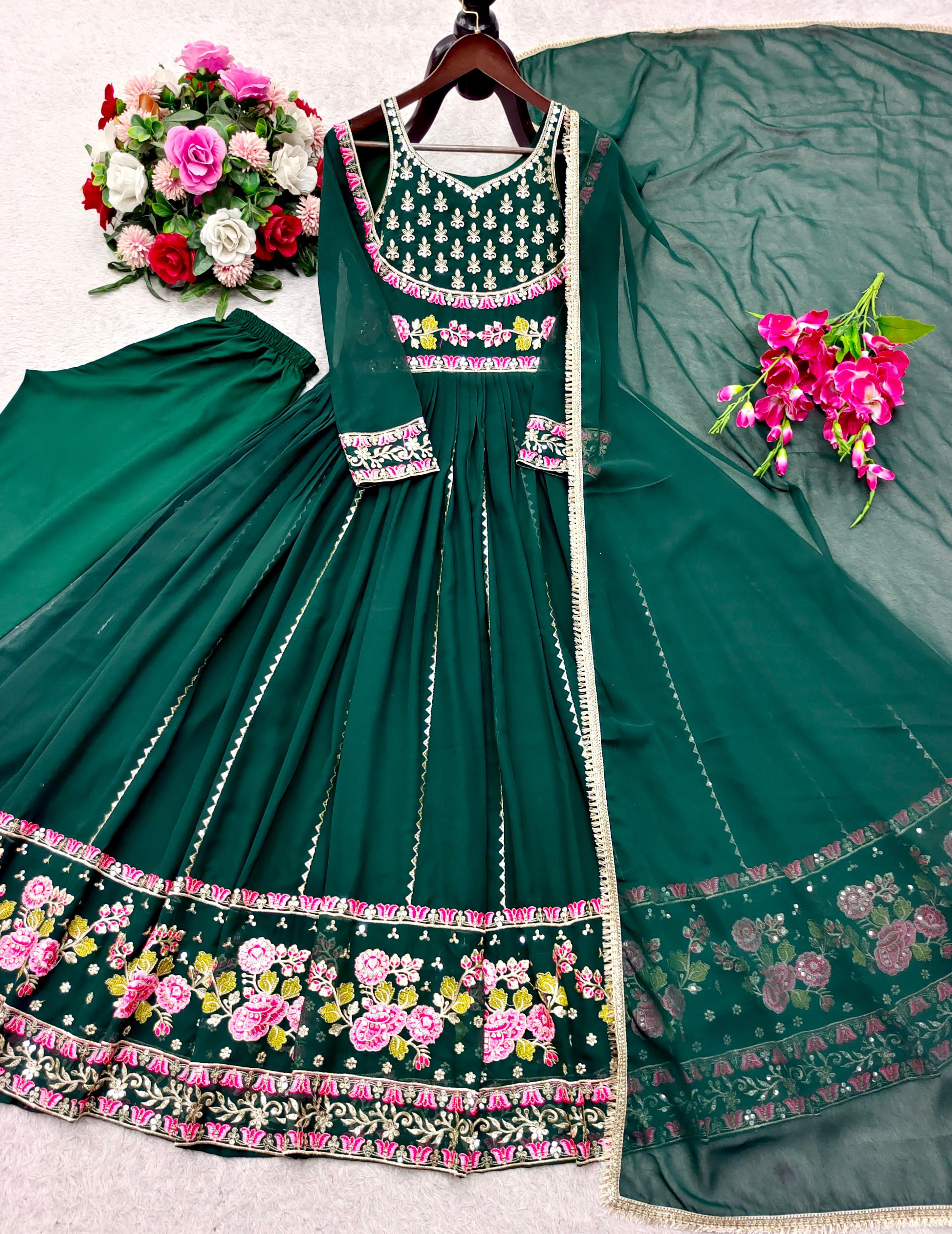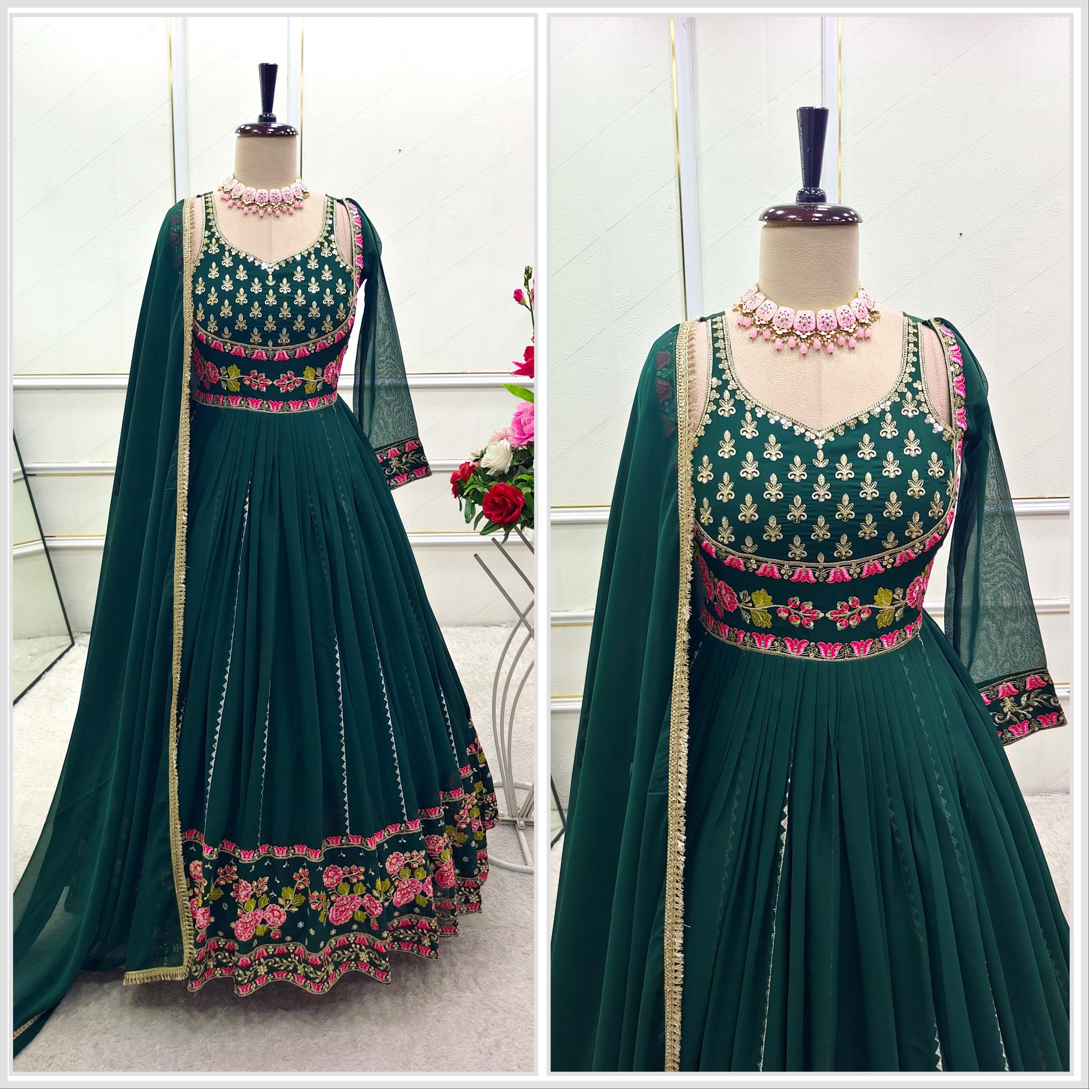 Trendy Green Georgette Embroidery Work Gown