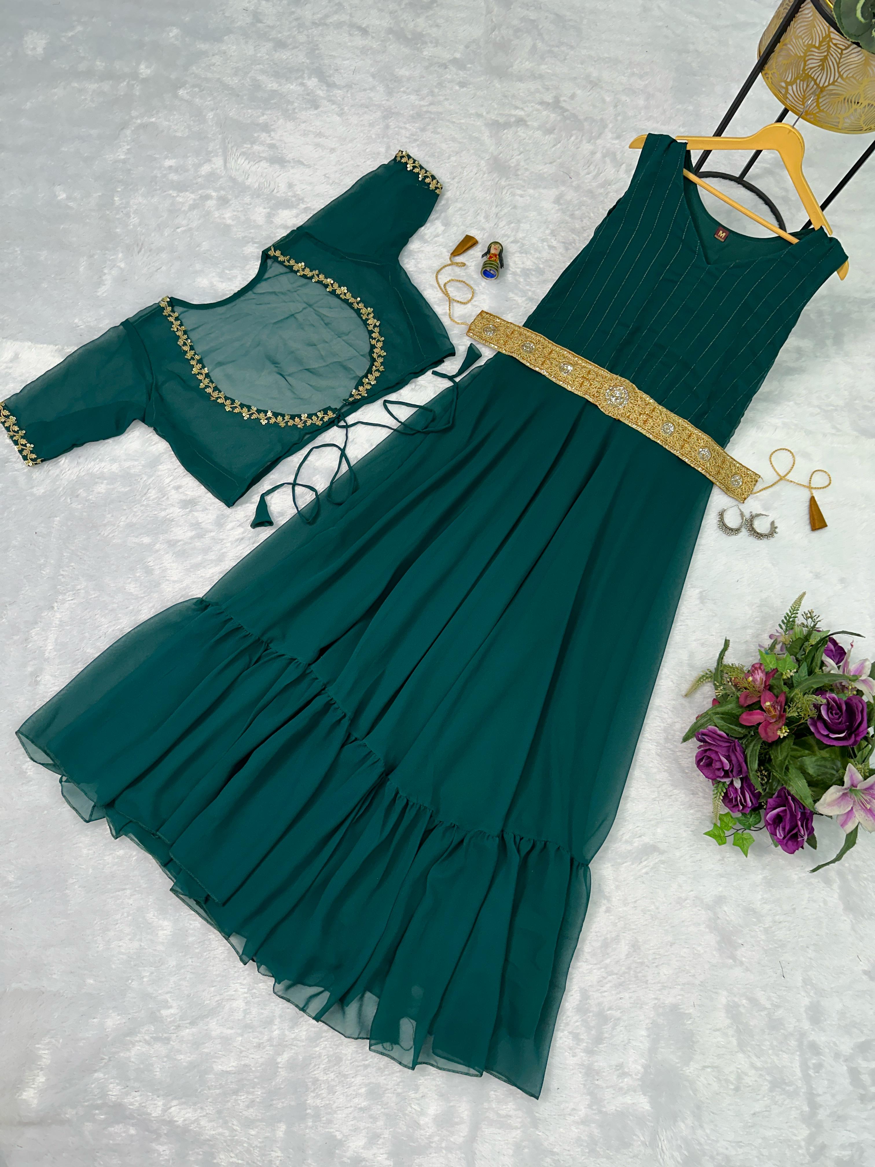 Wonderful Embroidery Work Mehndi Color Gown With Koti